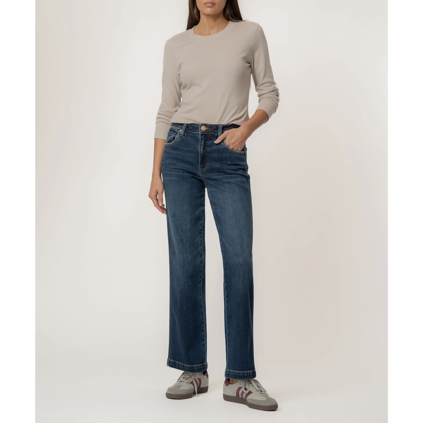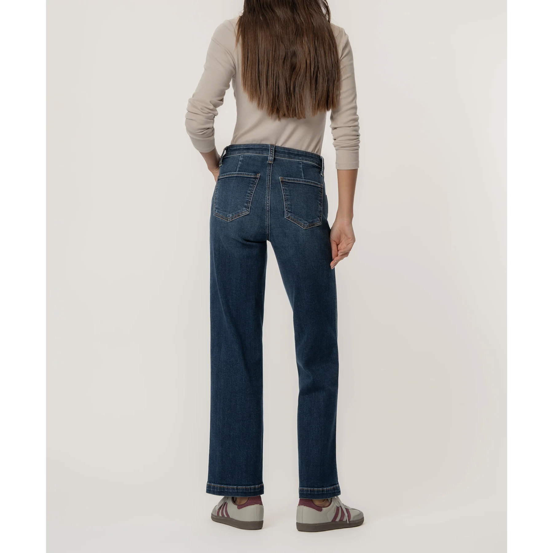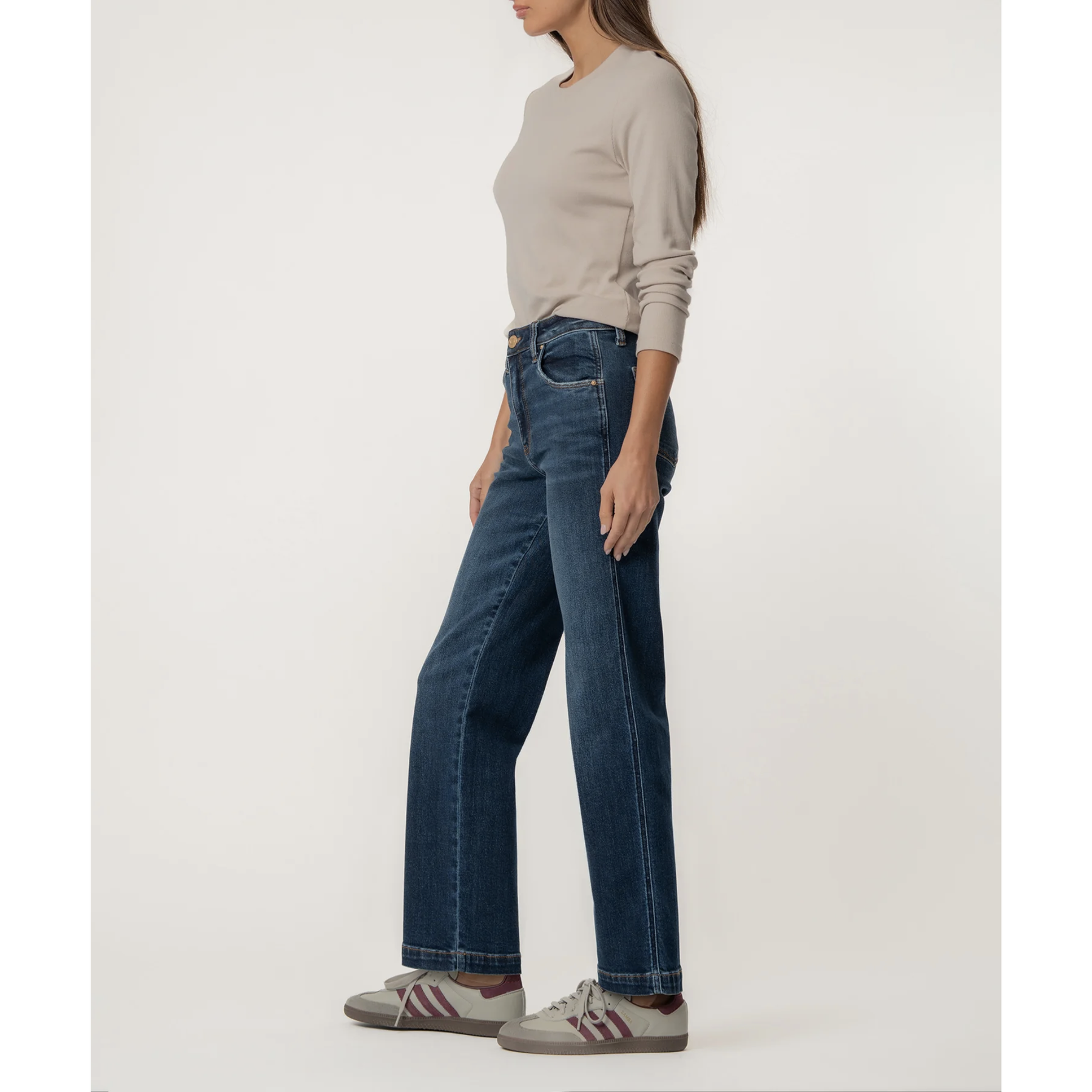 These high-rise straight-leg jeans feature a flattering silhouette and a timeless five-pocket style, finished in a deep, dark wash. Crafted from super-stretch fabric, they deliver lasting comfort while maintaining their shape throughout the day. Effortlessly stylish and easy to wear, they’re a versatile staple for any occasion.