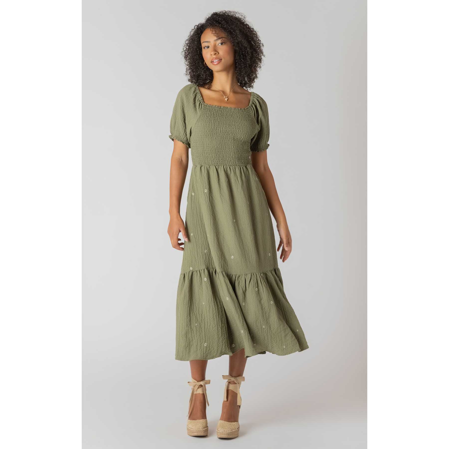 A smocked maxi dress with a square neckline, puff sleeves, and a softly tiered skirt. Easy, flattering, and perfect for effortless day-to-night wear.