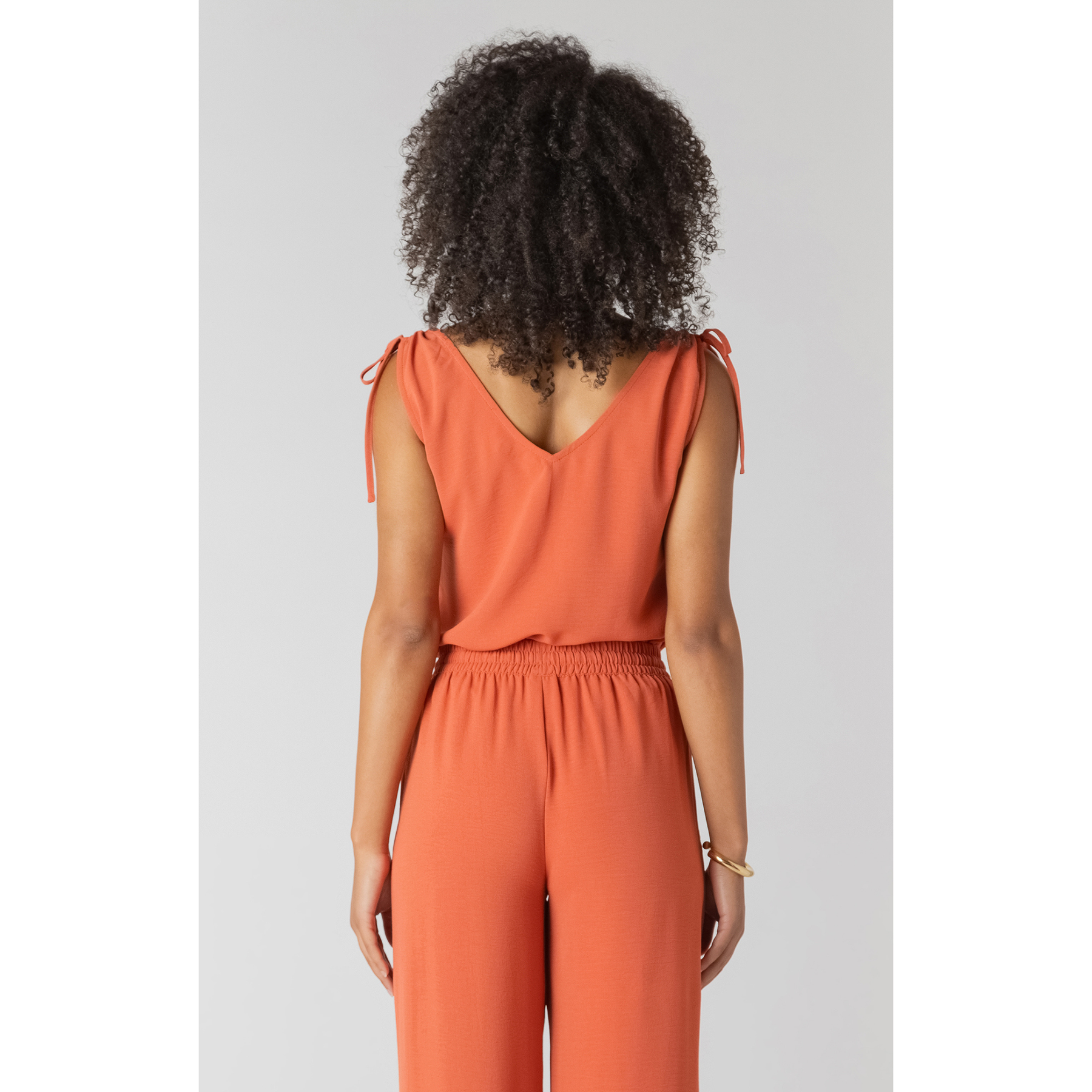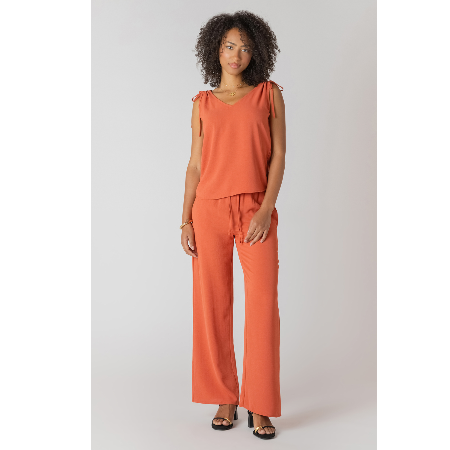 Soft and flowy, the Room 34 tie shoulder tank features a rich copper hue with delicate tie shoulder detailing. Designed with a flattering neckline and an easy, relaxed fit.