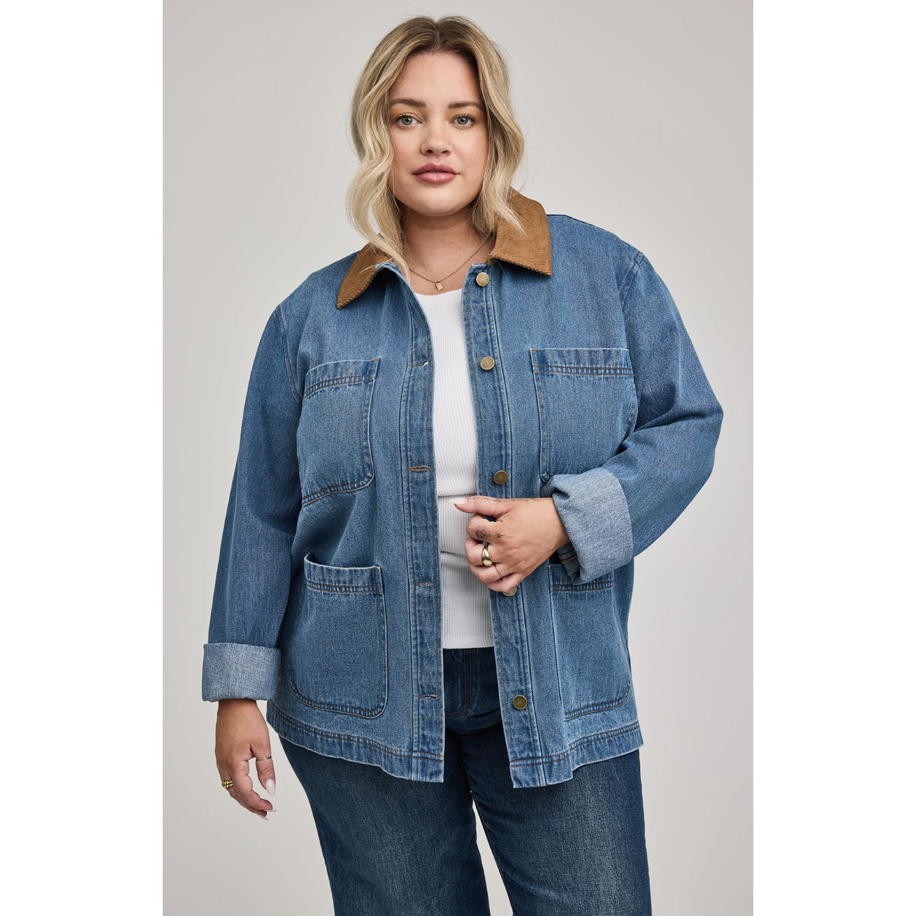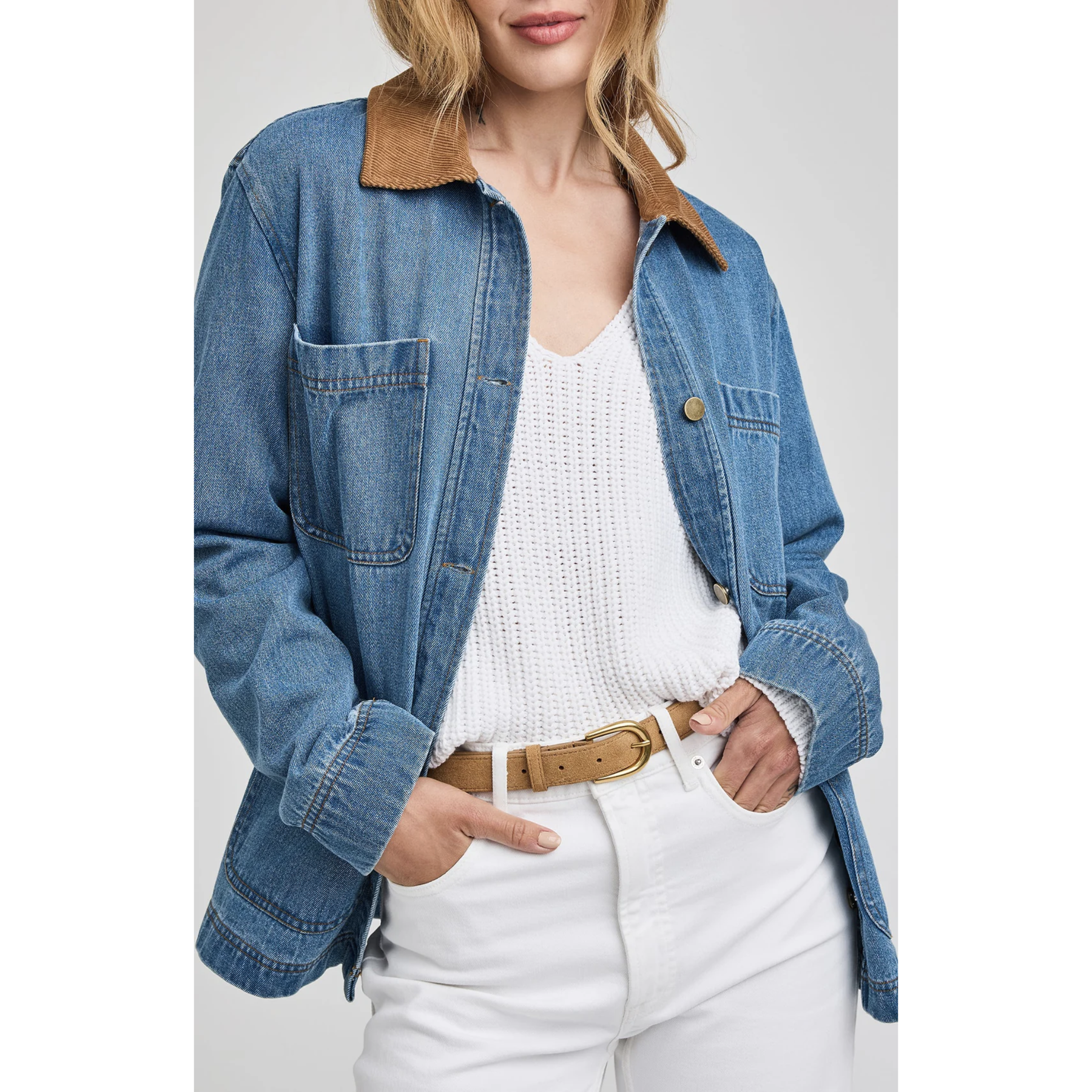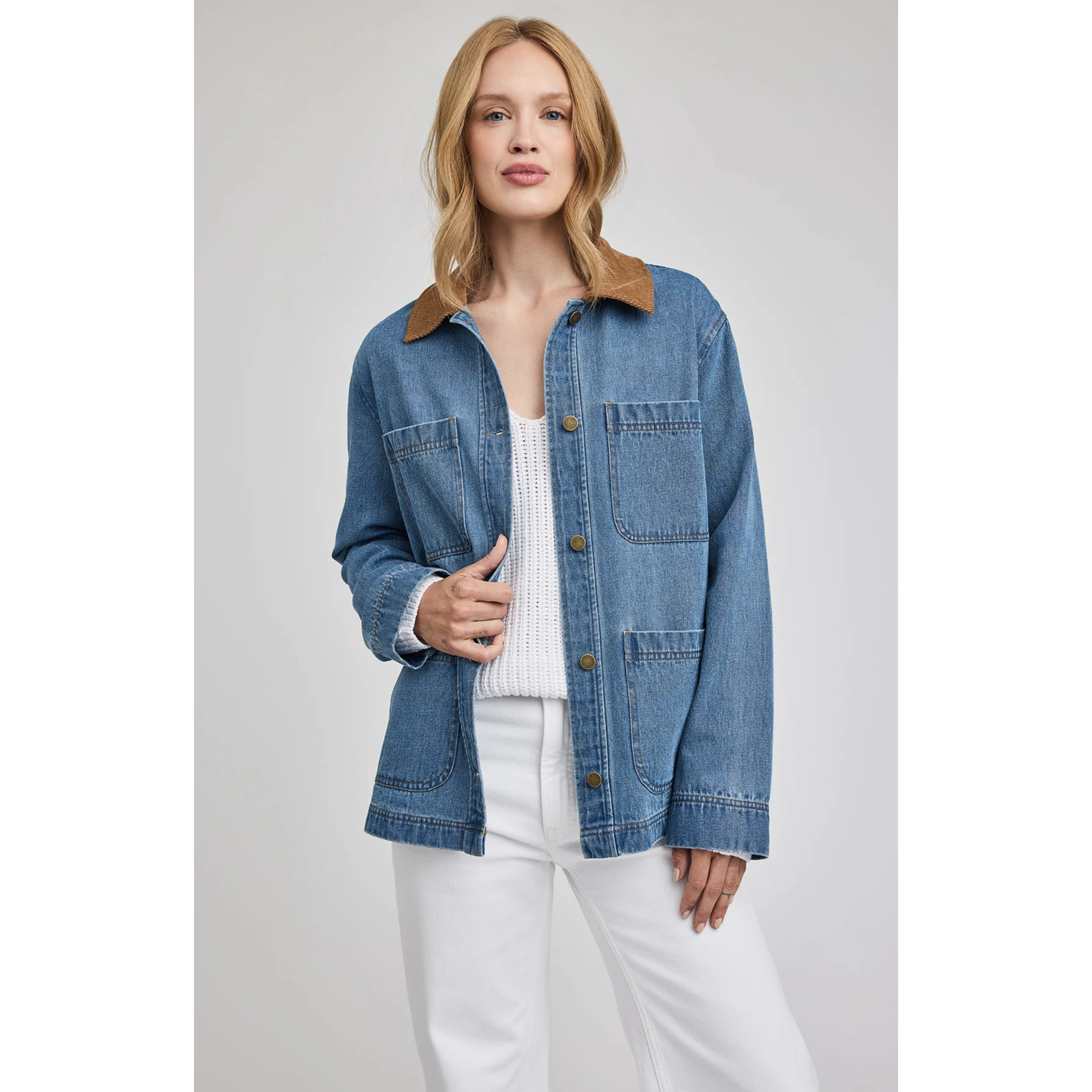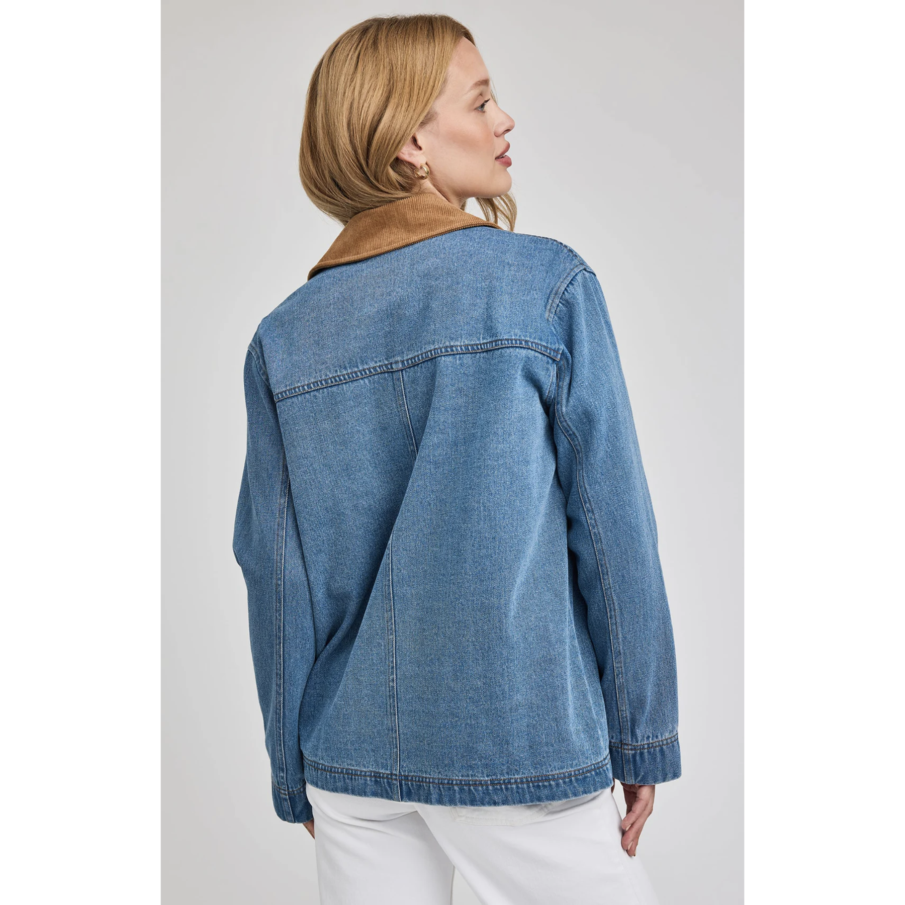 The Flynn jacket is made of a heavy weight denim fabric that has been specially washed for a perfectly lived-in look. The effortless silhouette with a relaxed fit features patch pockets and a contrast corduroy collar.