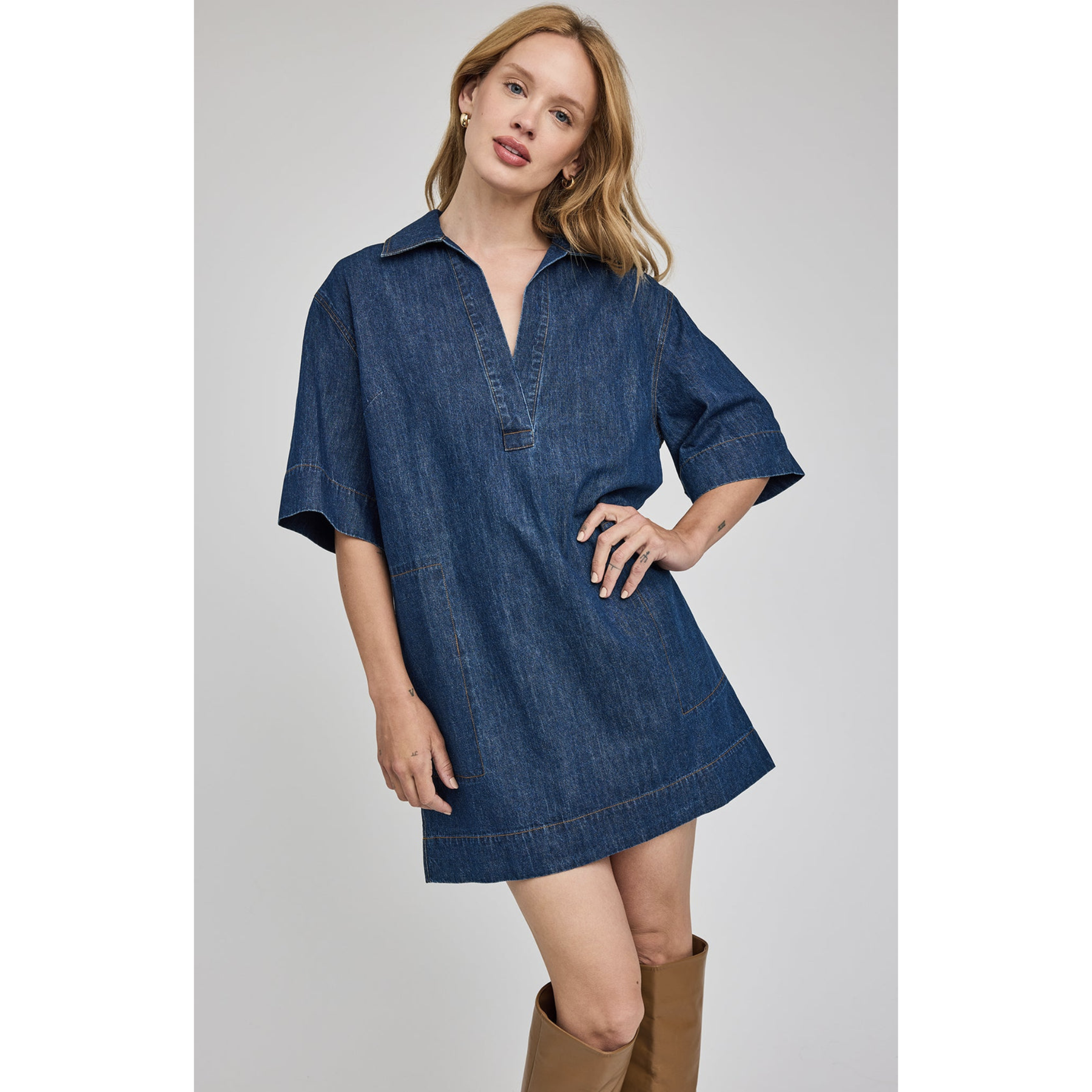 The Evelina dress is made of a denim fabric that has been specially washed for a perfectly lived-in look. Features include a collar with a v-neckline and side seam pockets.