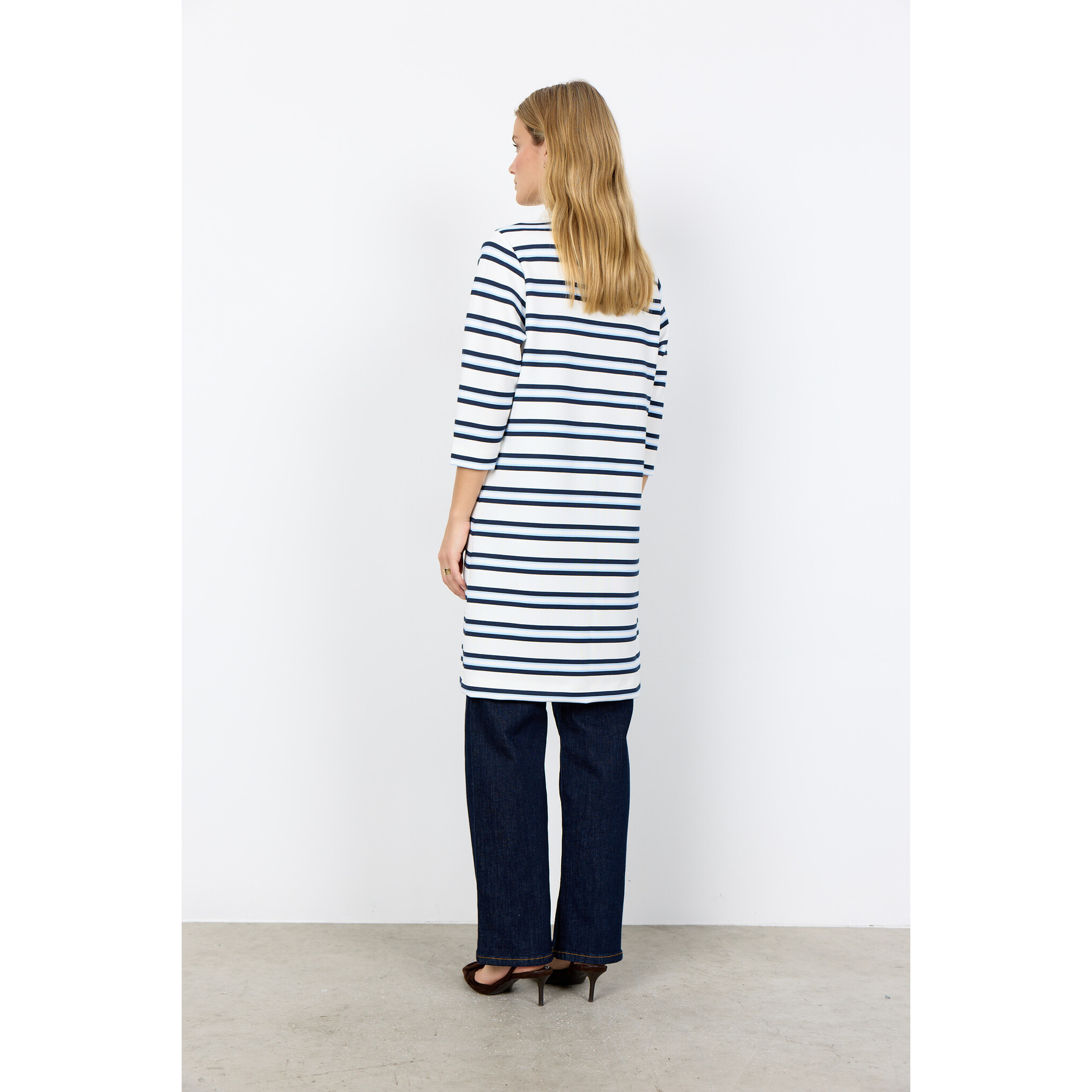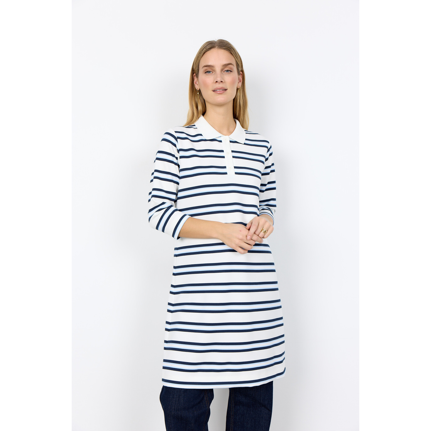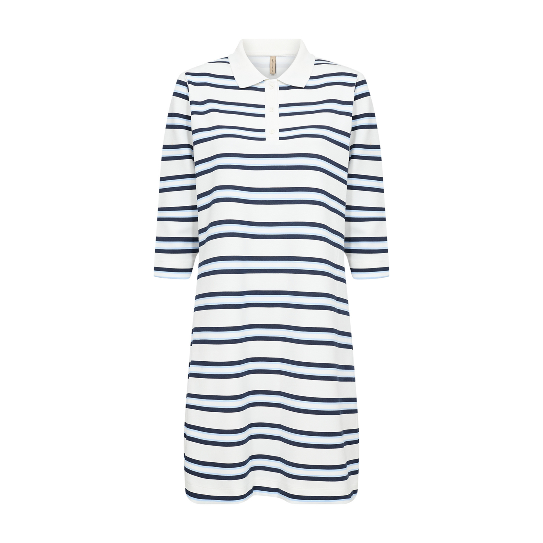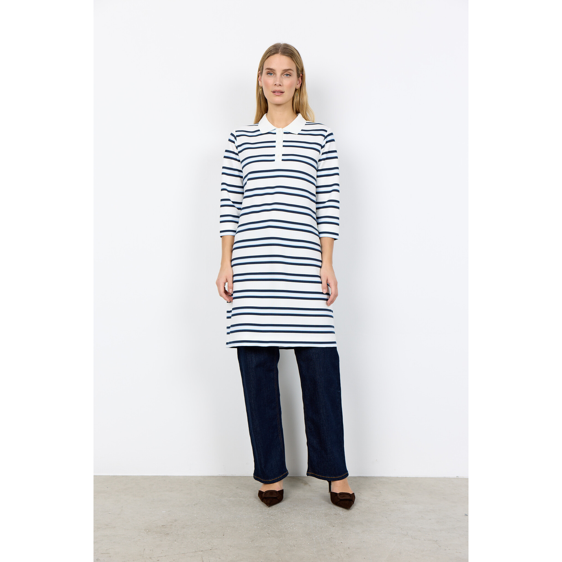 The SC-BARNI 55 Dress has a classic collar and buttons down the front, with an elegant striped pattern. Wear it with sandals for a casual look or with heels for a more dressed-up style.