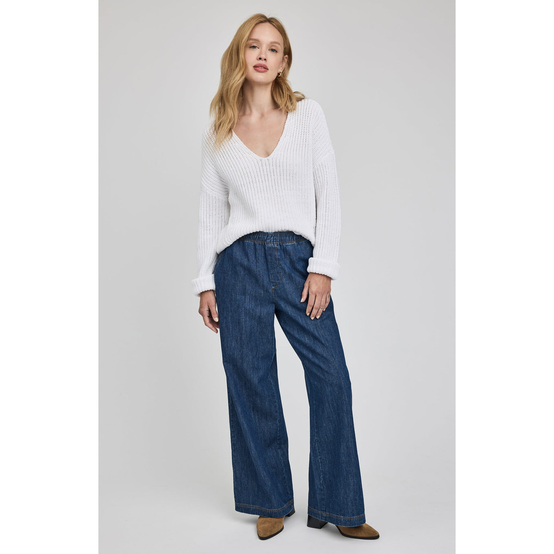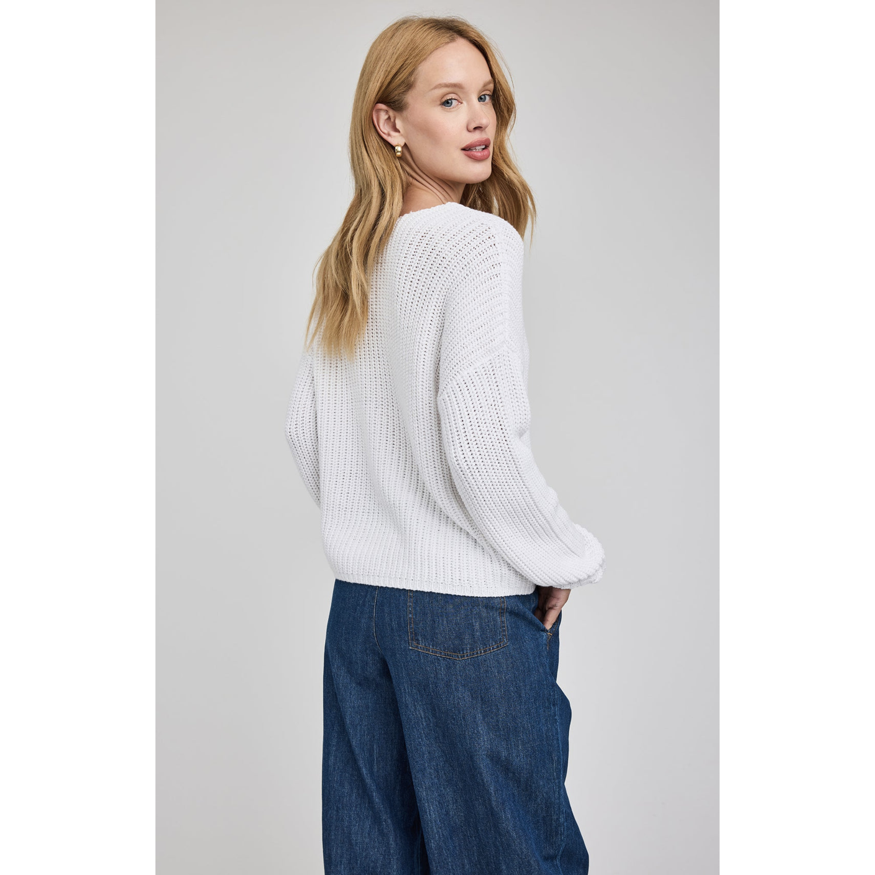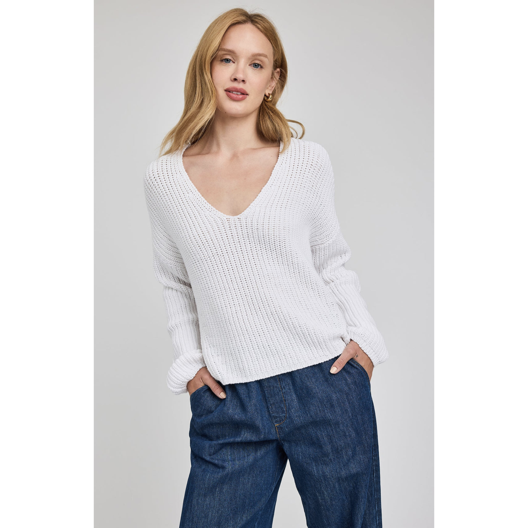 The Spencer sweater has a relaxed fit and is made of a soft cotton yarn in a half cardigan stitch. Features include a v-neckline and fashioning stitch details throughout.