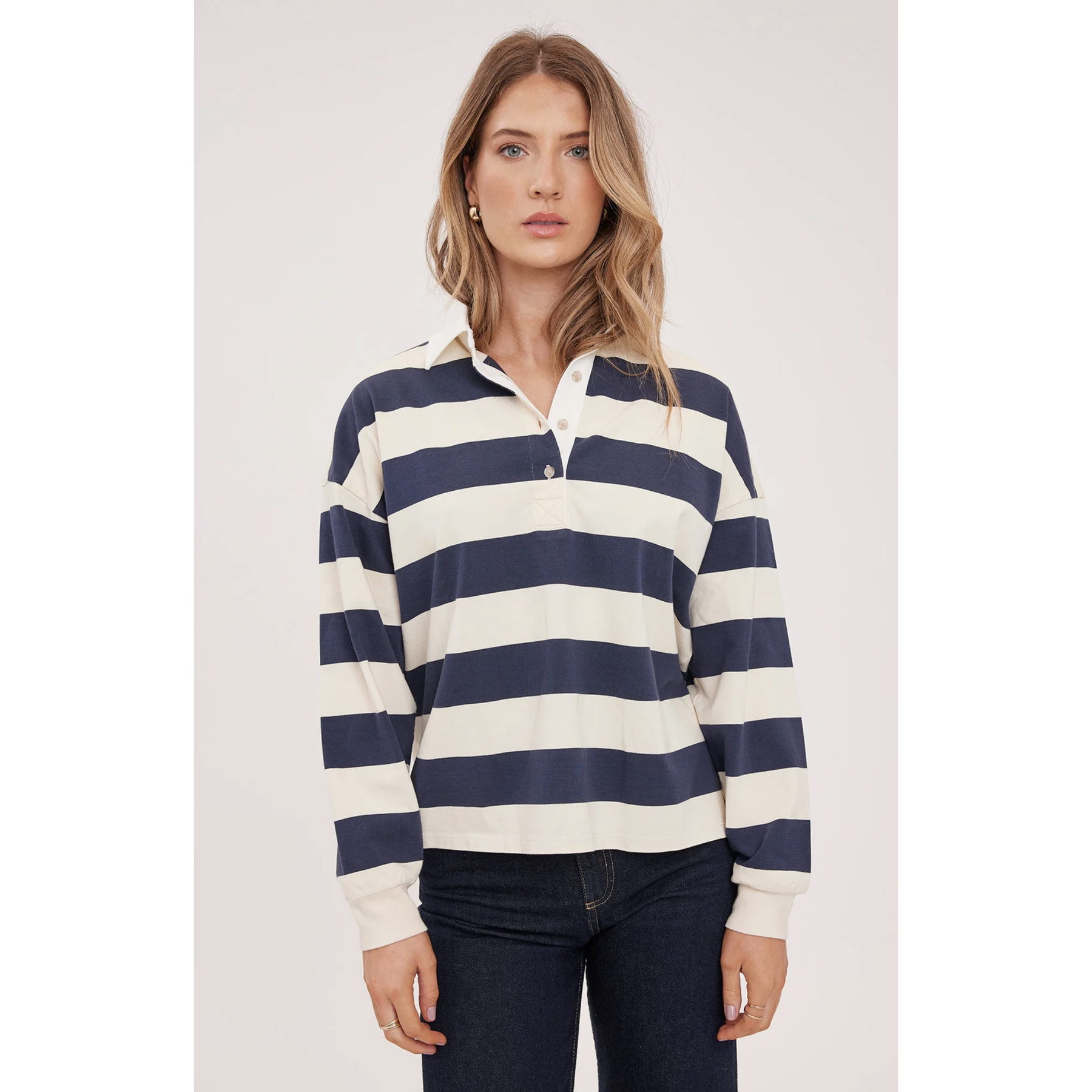 The Britt shirt is crafted from soft cotton jersey and showcases a timeless rugby stripe pattern. It’s designed with a contrasting collar, a half-button placket, and side slits for added comfort and ease of movement.