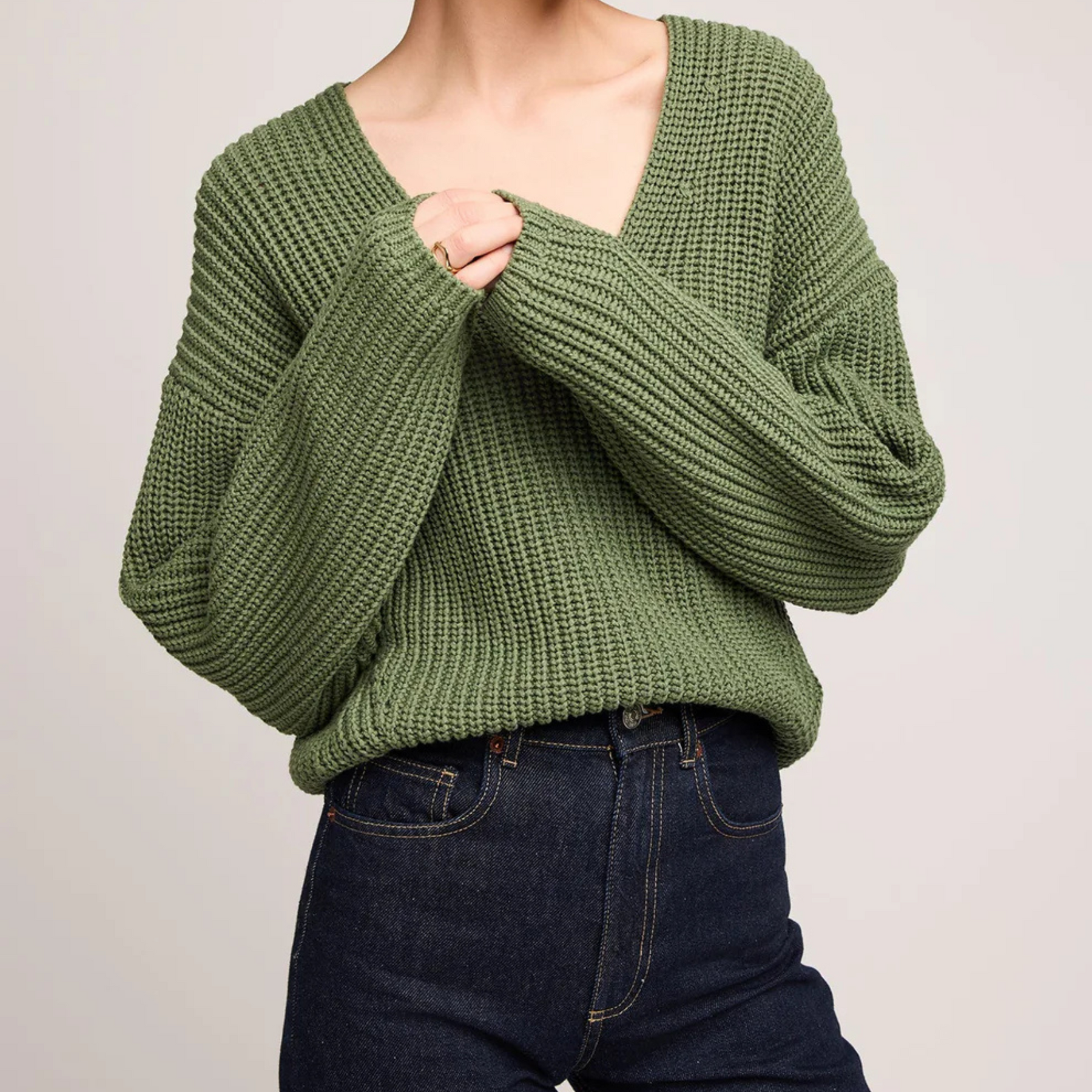 The Spencer sweater is made of a soft cotton yarn in a half cardigan stitch. Features include a v-neckline and fashioning stitch details throughout.