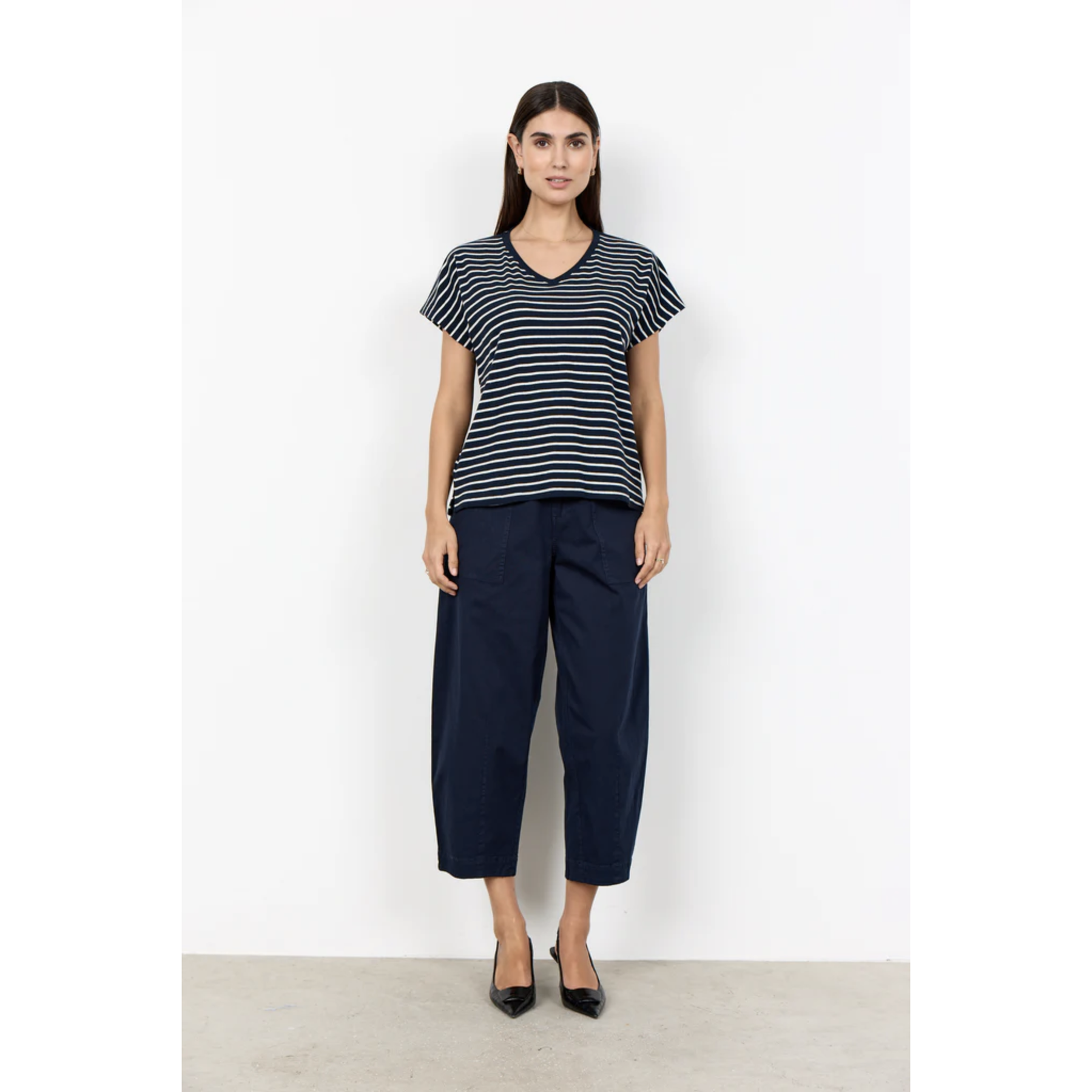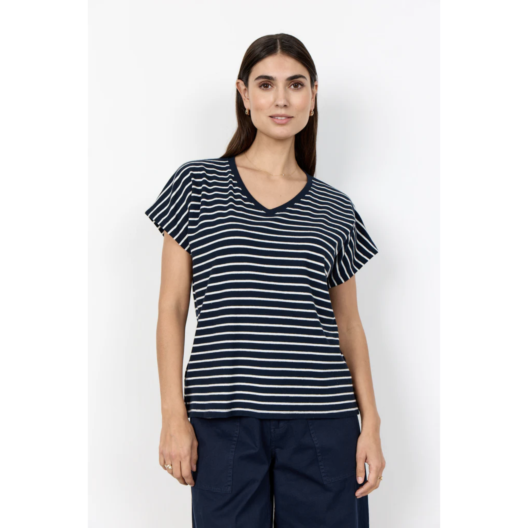 The Soya Concept Caimie 1 is an easy-to-wear tee featuring a flattering V-neck and timeless horizontal stripes. Designed for everyday comfort, it pairs effortlessly with jeans or shorts for a relaxed yet polished outfit.