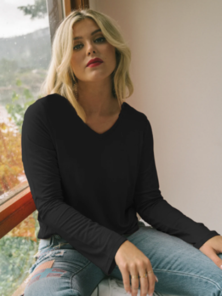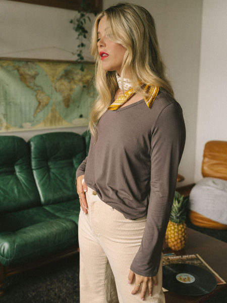If you like the Girlfriend Tee, you will love this long-sleeved version for Fall. We've updated the neckline with a fold-over double stitch so it won't stretch out on you. Dress this beauty up with a blazer and trousers for a more sophisticated/work-friendly feel, or wear it with denim and a moto jacket for a more casual look.