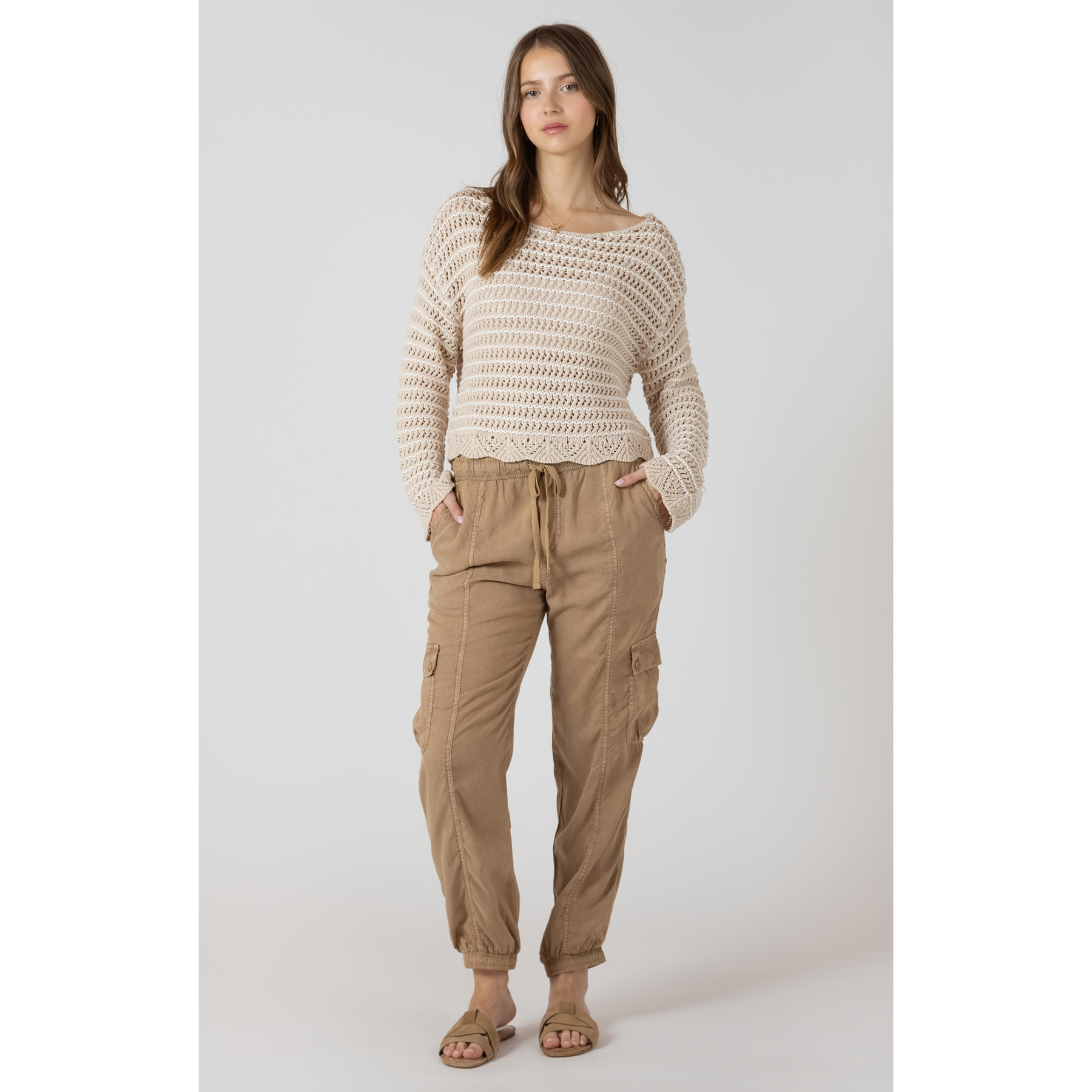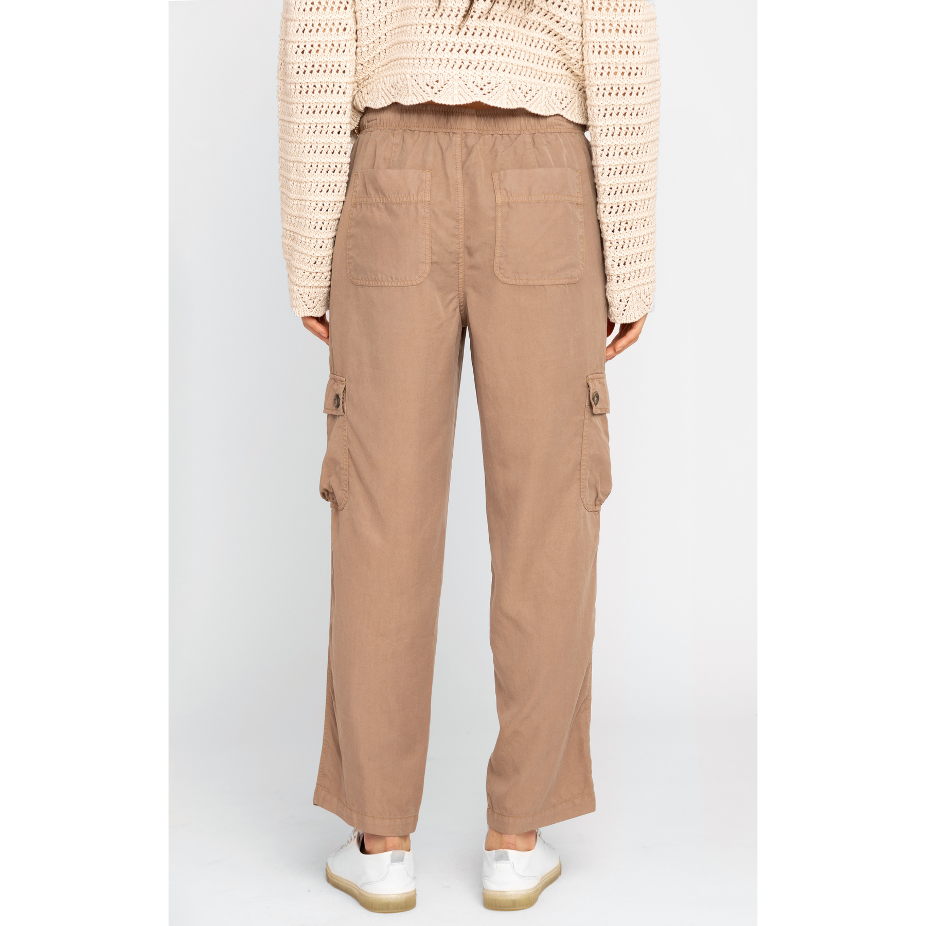Effortlessly elevated, these DEX cargo joggers feature a soft safari wash with a relaxed silhouette. Designed with functional cargo pockets and a flattering tie waist, they deliver everyday comfort with a polished, casual edge. Perfect for easy, off-duty styling.