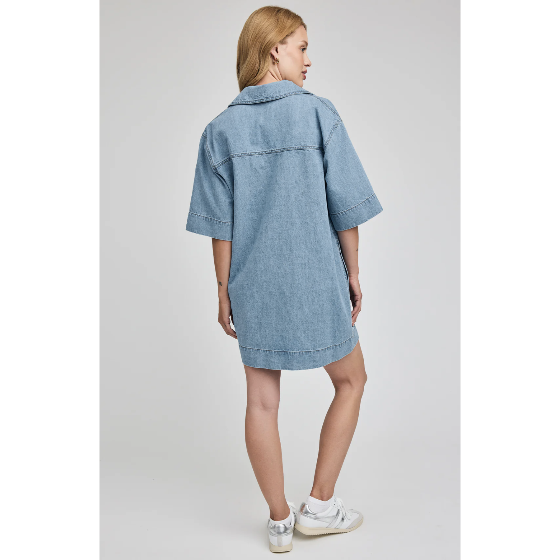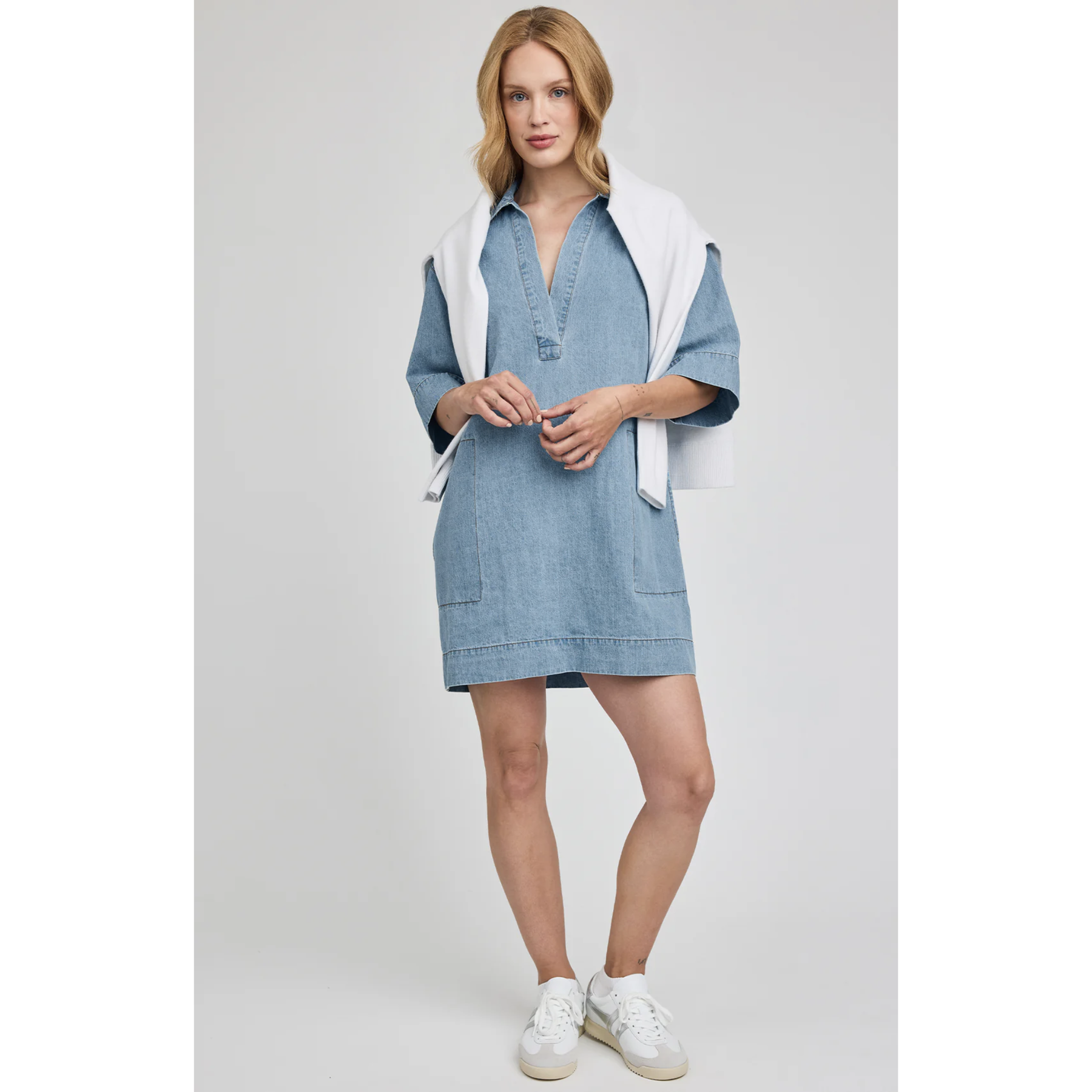 The Evelina dress is made of a denim fabric that has been specially washed for a perfectly lived-in look. Features include a collar with a v-neckline and side seam pockets.