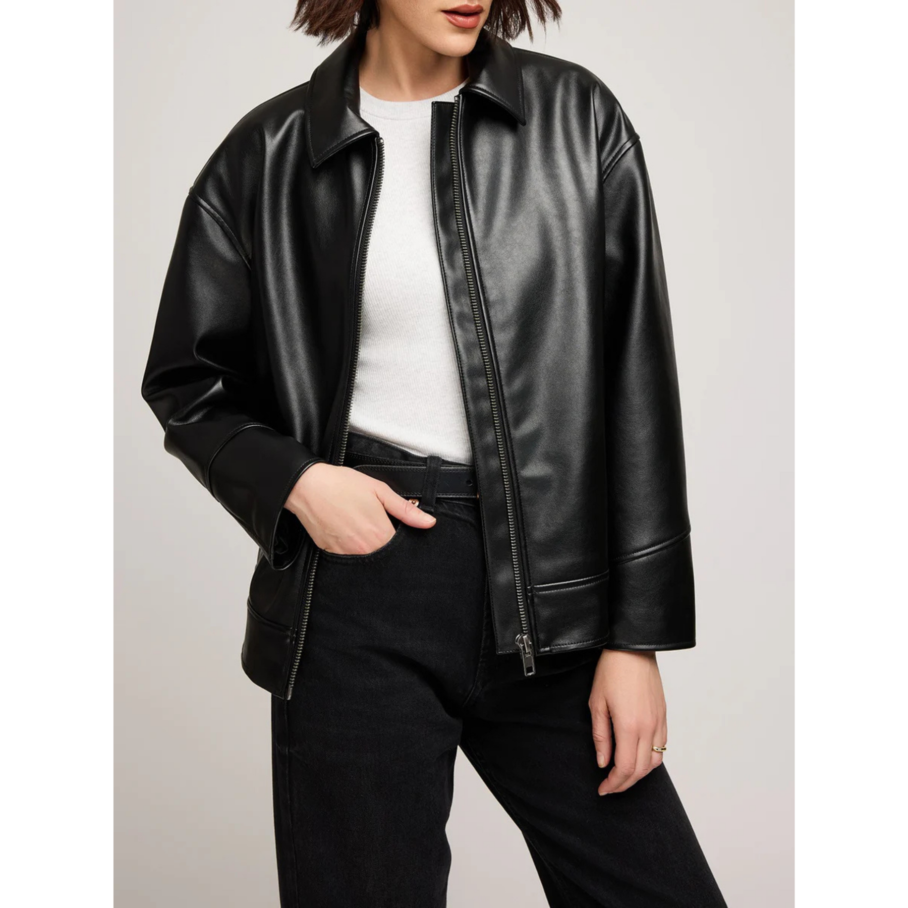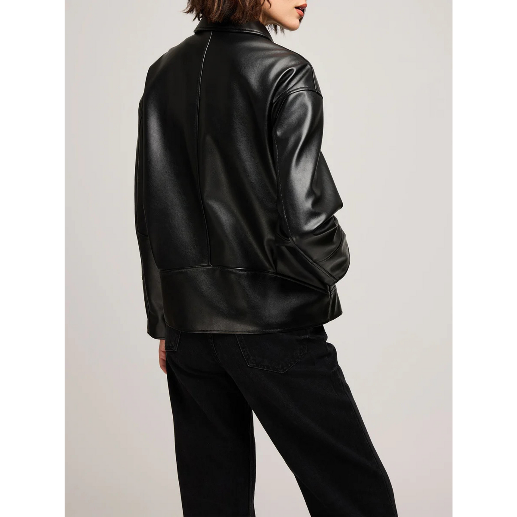 The Audrey jacket is made of a faux leatherette that has been specially washed to achieve a perfectly lived-in appearance. Features include welt pockets, back pleat detail, and a metal zipper closure. Inspired by vintage silhouettes, the Audrey jacket will elevate any outfit.