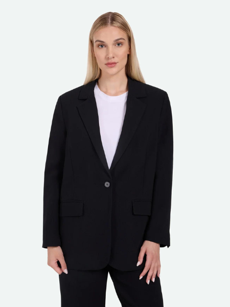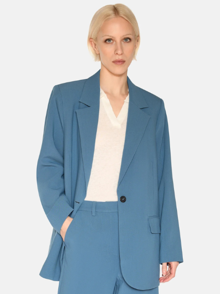 Novi is a modern classic blazer with tailored look and is crafted from 79% recycle polyester, 17% viscose and 4% elastane. The blazer has a slightly oversized fit and features shoulder pads and a minimalistic lapel collar. It is detailed with a single button, pockets and a slit at back. The model is 180 cm tall and wears a size 36.