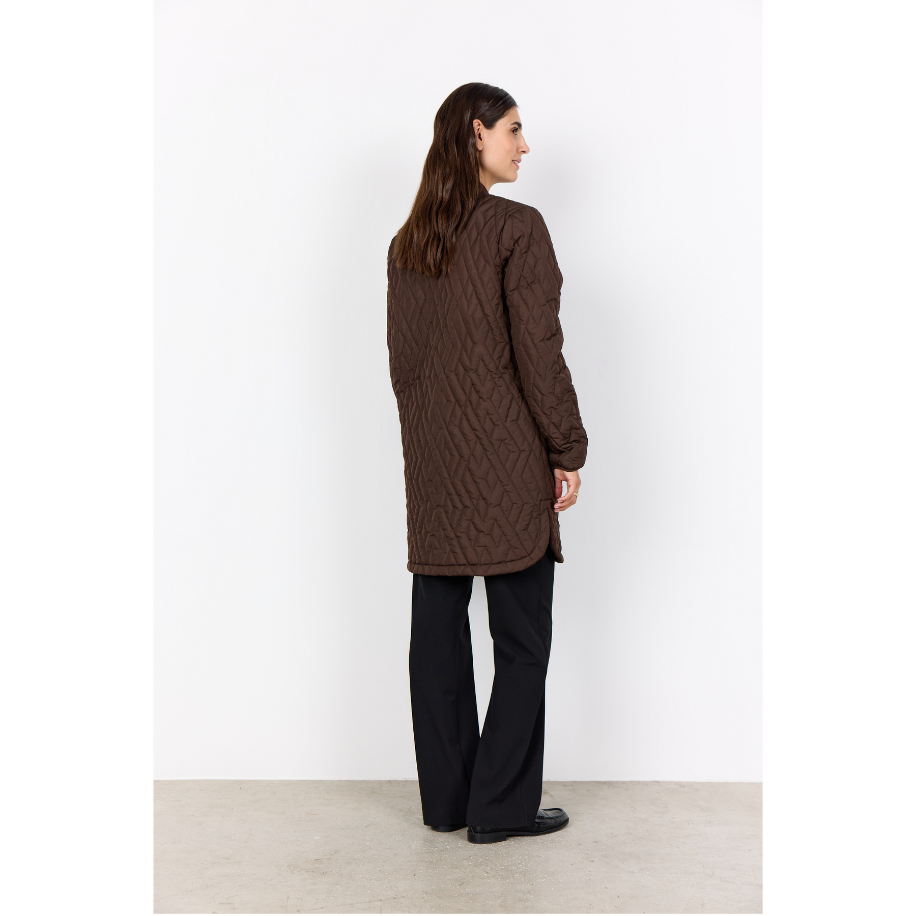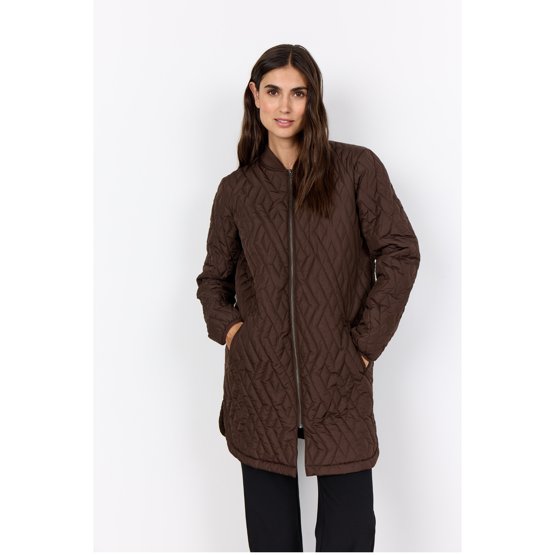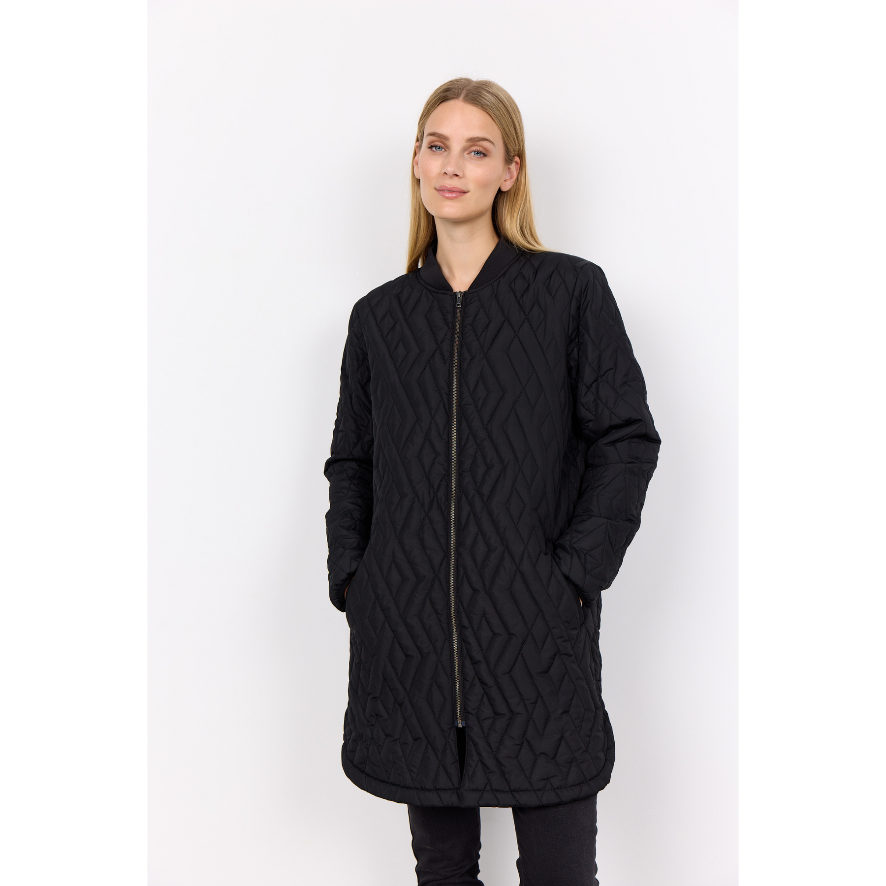This nice quilted jacket in a polyester quality. It has a zipper closure, two pockets at the front and a long fit. This jacket is a basic item in every wardrobe, and it is perferct for the cold weather.