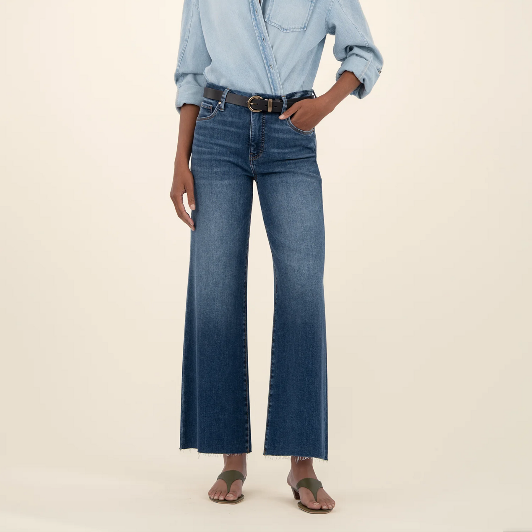 Flatter your figure with these high rise wide leg jeans in a rich dark wash color. Designed with built-in Fab Ab pockets for a smooth silhouette, they’re finished with a modern raw hem for an effortlessly cool look.