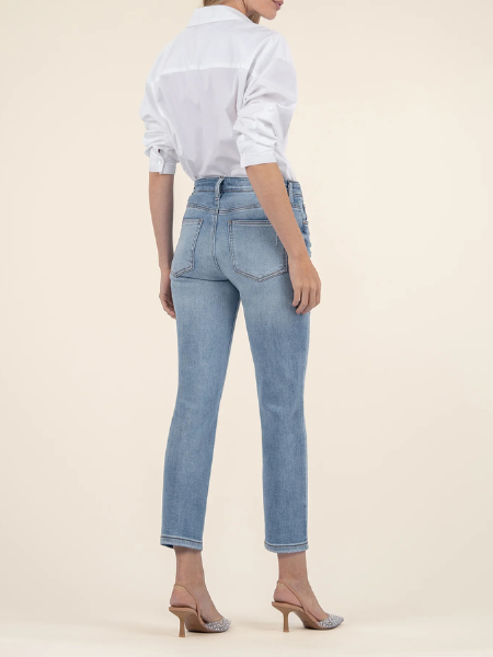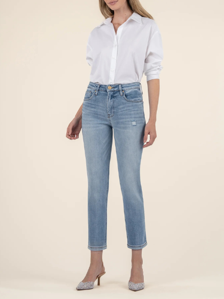 These high-rise, tapered, and cropped jeans offer a touch of subtle distressing, while the Fab Ab front pockets provide a slimming effect that comfortably enhances your shape.
