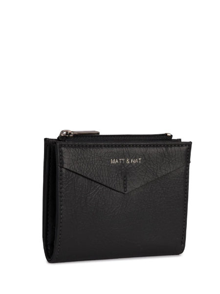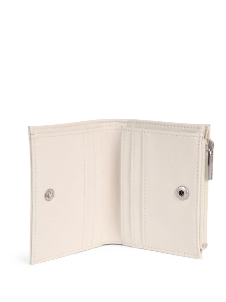Folded wallet with snap closure, zippered coin pocket, and card slots inside.