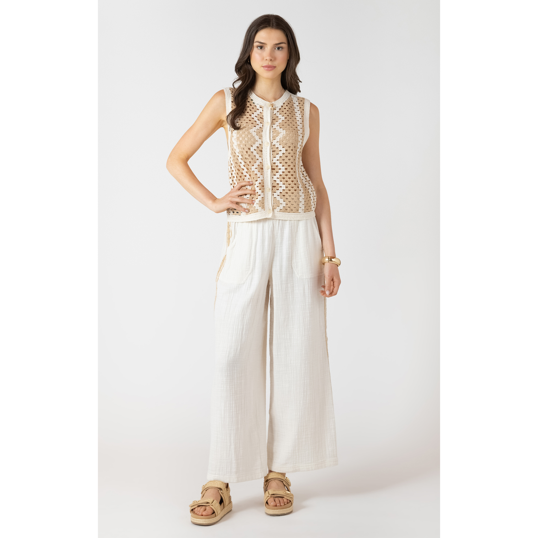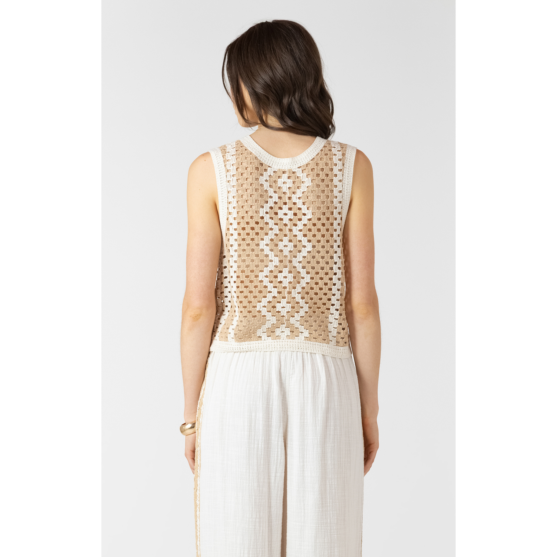 The Dex Open Work Sweater features a lightweight, breathable knit with intricate openwork detailing for a soft, textured look. Designed with a sleeveless silhouette and front button detail, it’s an effortlessly chic layering piece for any season.
