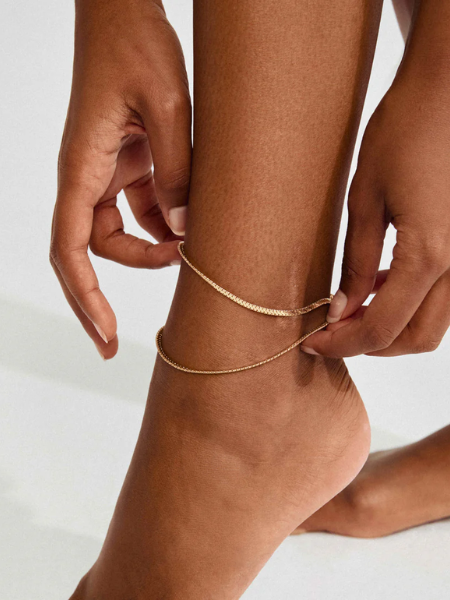 Wherever you go! The gold-plated or silver-plated JELONA anklet is the perfect new addition to your accessory collection. Featuring two flat snake chains, also known as Herringbone chains, you'll achieve a unique layered look. The smooth links beautifully catch the light, adding an extra touch of summer vibes to your outfit. Ideal for sun-kissed ankles and sandals, the JELONA ankle chain is both elegant and effortlessly stylish. Pair it with your summer favourites for a chic beachy feel. Crafted from 99% recycled material, allowing you to shine with a clear conscience.