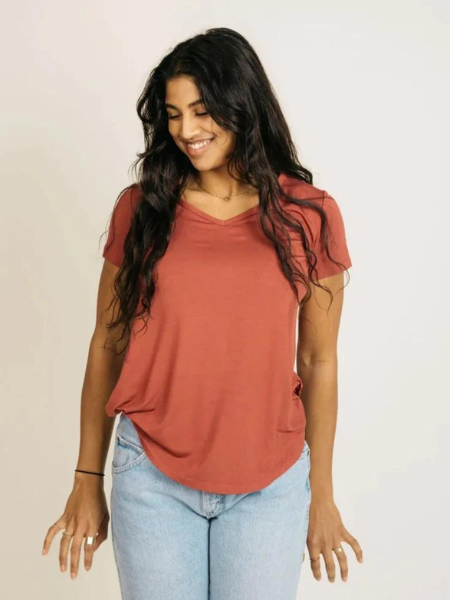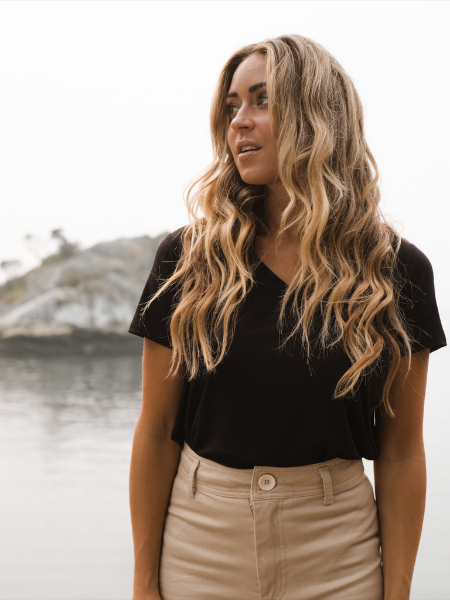 The girlfriend tee is your new bestie! The classic v-neck will pair perfectly with any look. This favourite tee is luxe! We've updated the fabric for an even dreamier feel. It's silky texture drapes the body beautifully. It’s your everyday tee with a more sophisticated feel.