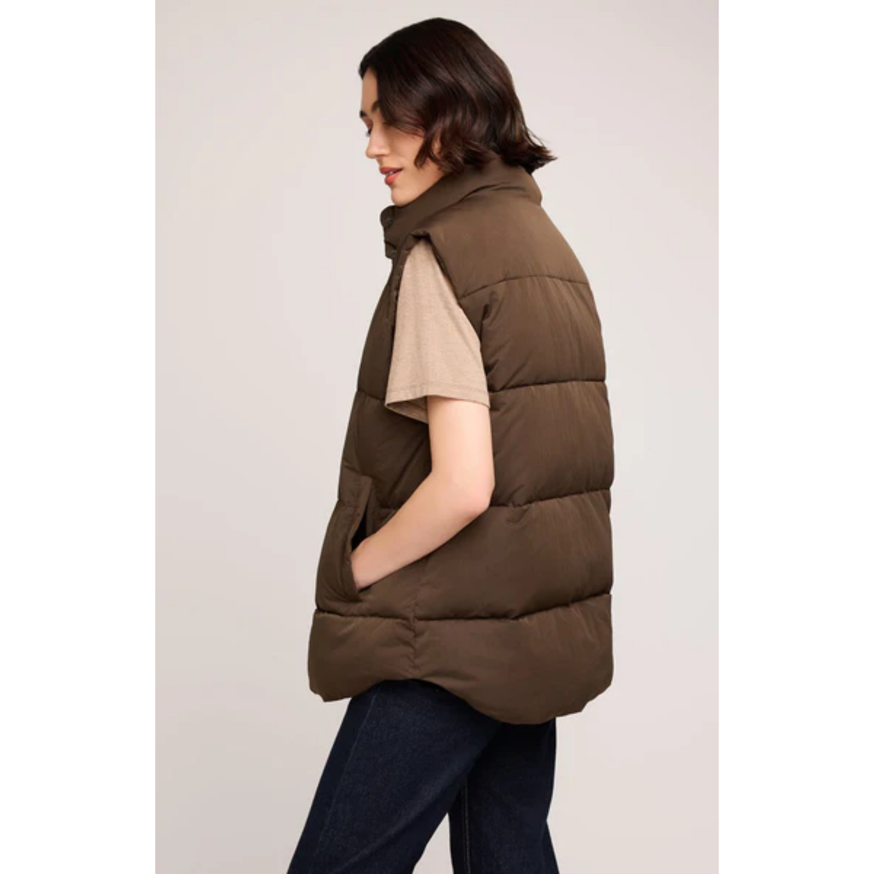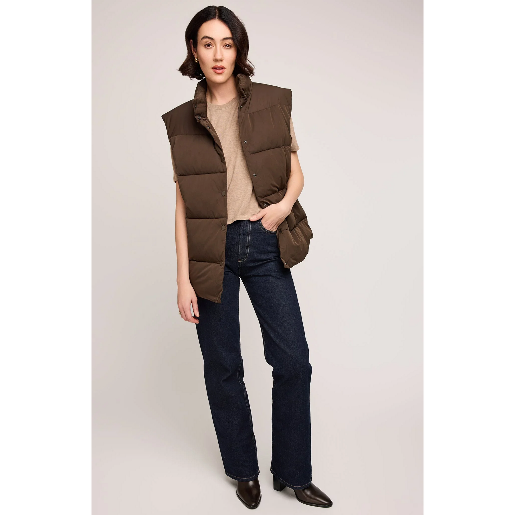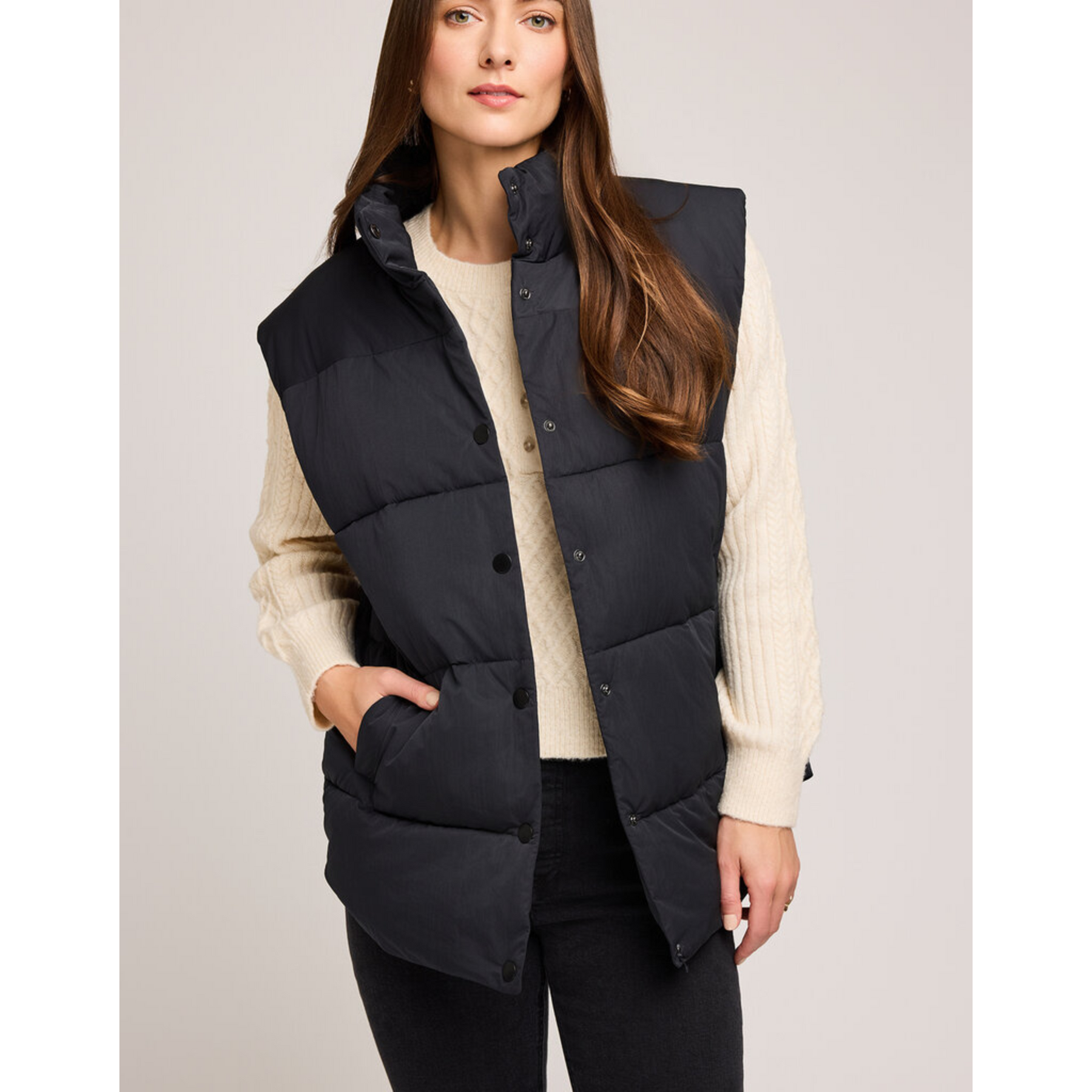 The Nora vest is made of a nylon fabric with the perfect amount of fill to keep you warm and cozy. Features include a front snap closure and welt pockets.