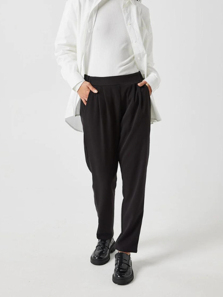 Sofja 2.0 e54 is a pleated pants style, crafted from a classic tailored fabric blend of viscose and polyester with stretch. They are designed with a regular elastic waist, a pleated front, tapered legs and an above ankle-length. The pants are finished with side slant pockets and back welt pockets.