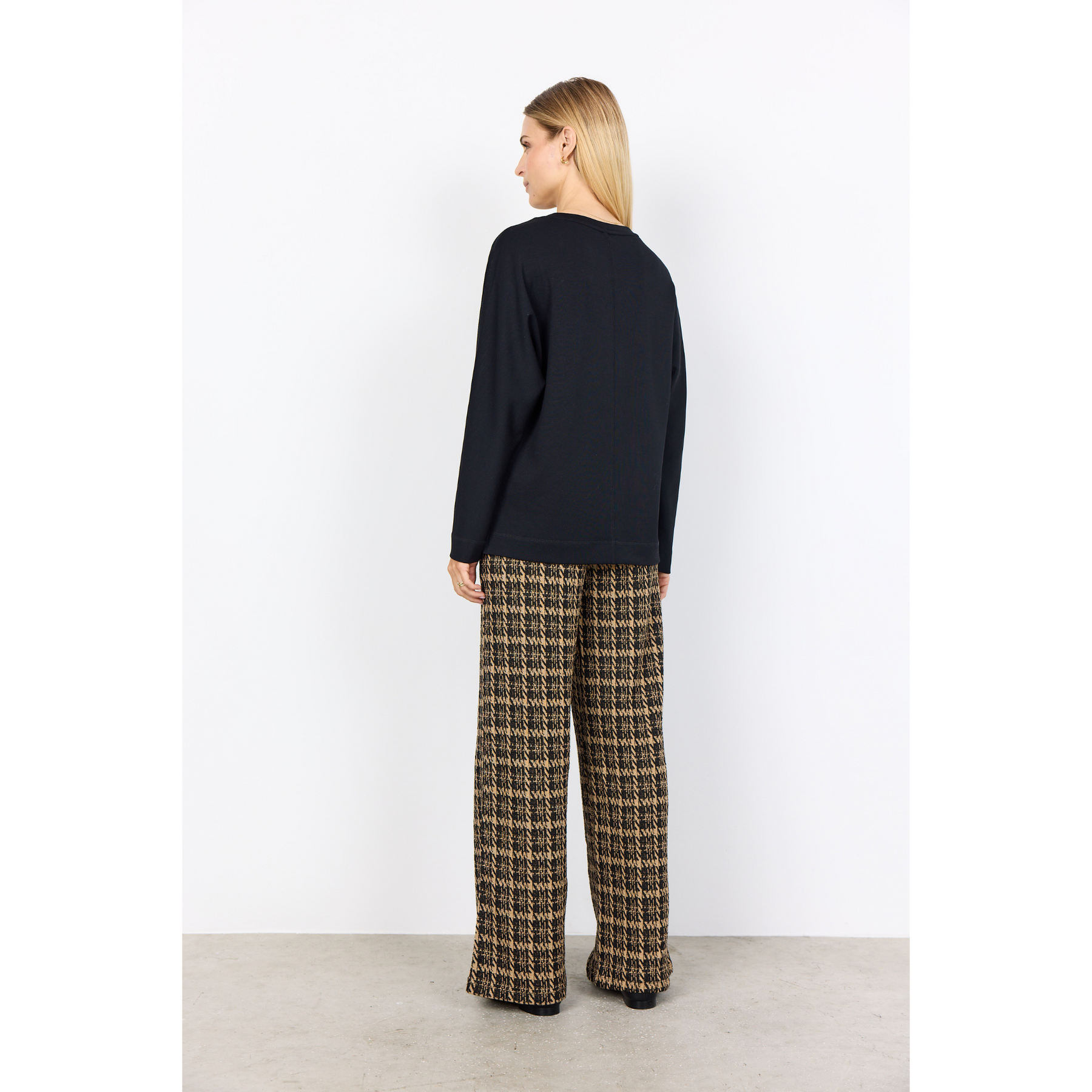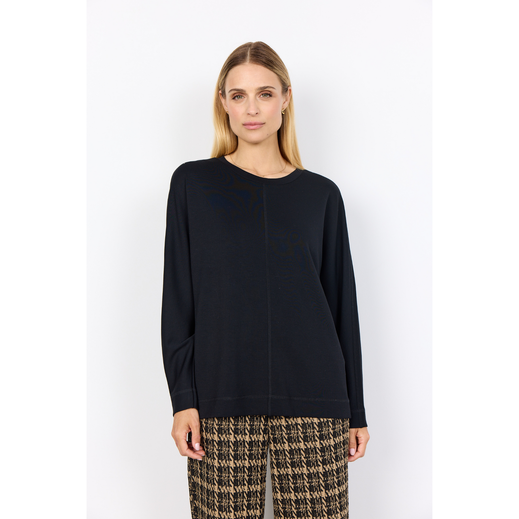 This blouse features a crew neckline, a straight cut, and visible seam details down the front and around the cuffs. Pair it with tailored trousers or a pencil skirt for a structured, modern look.