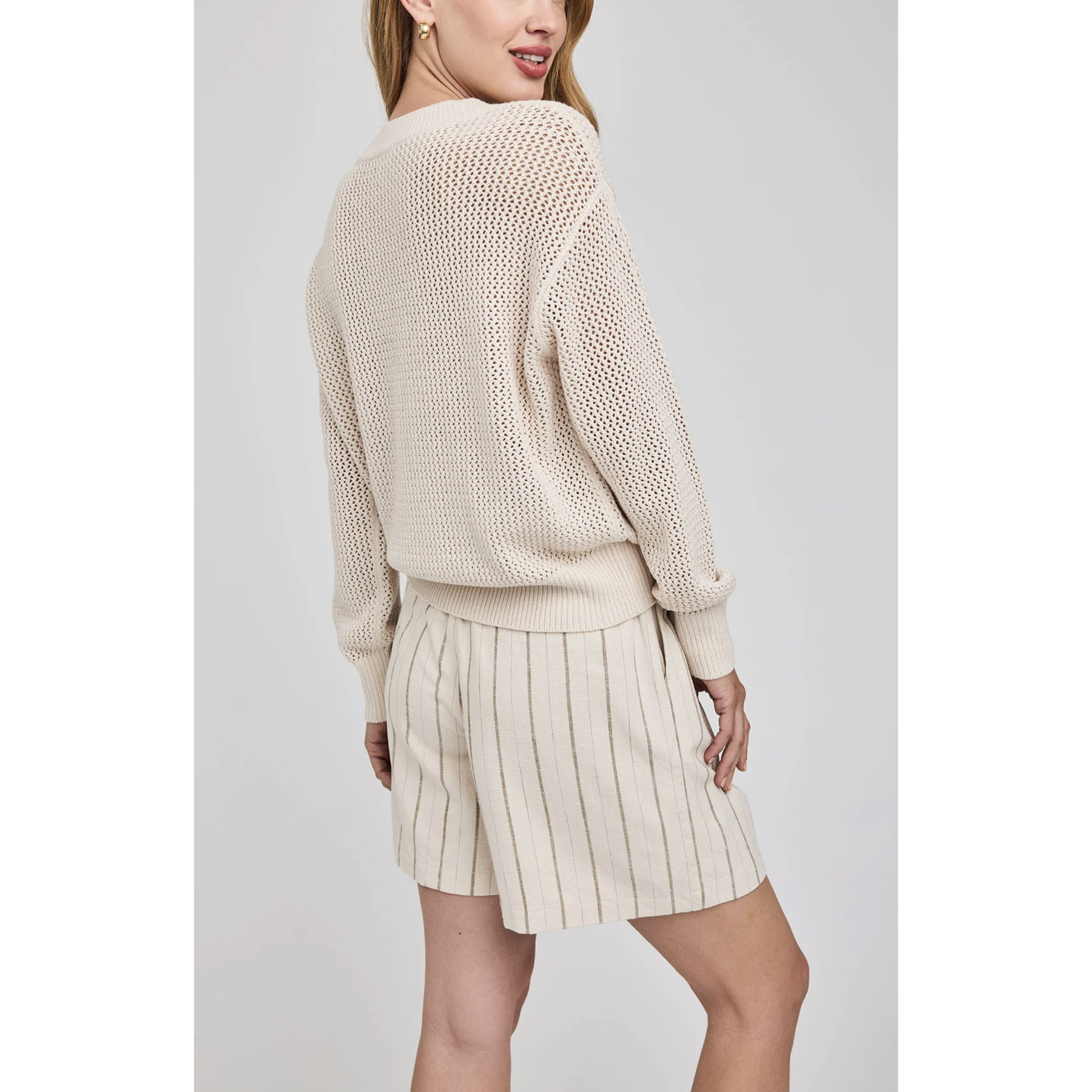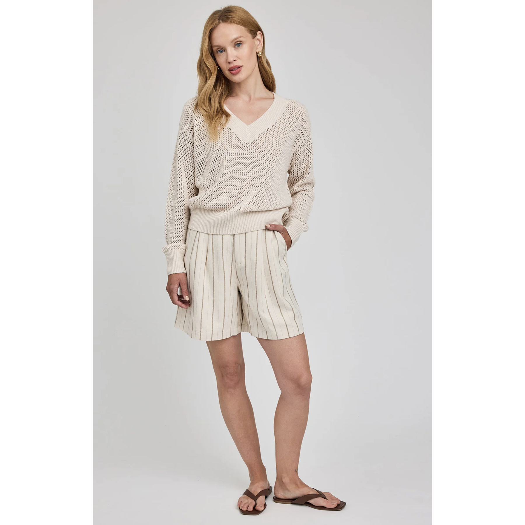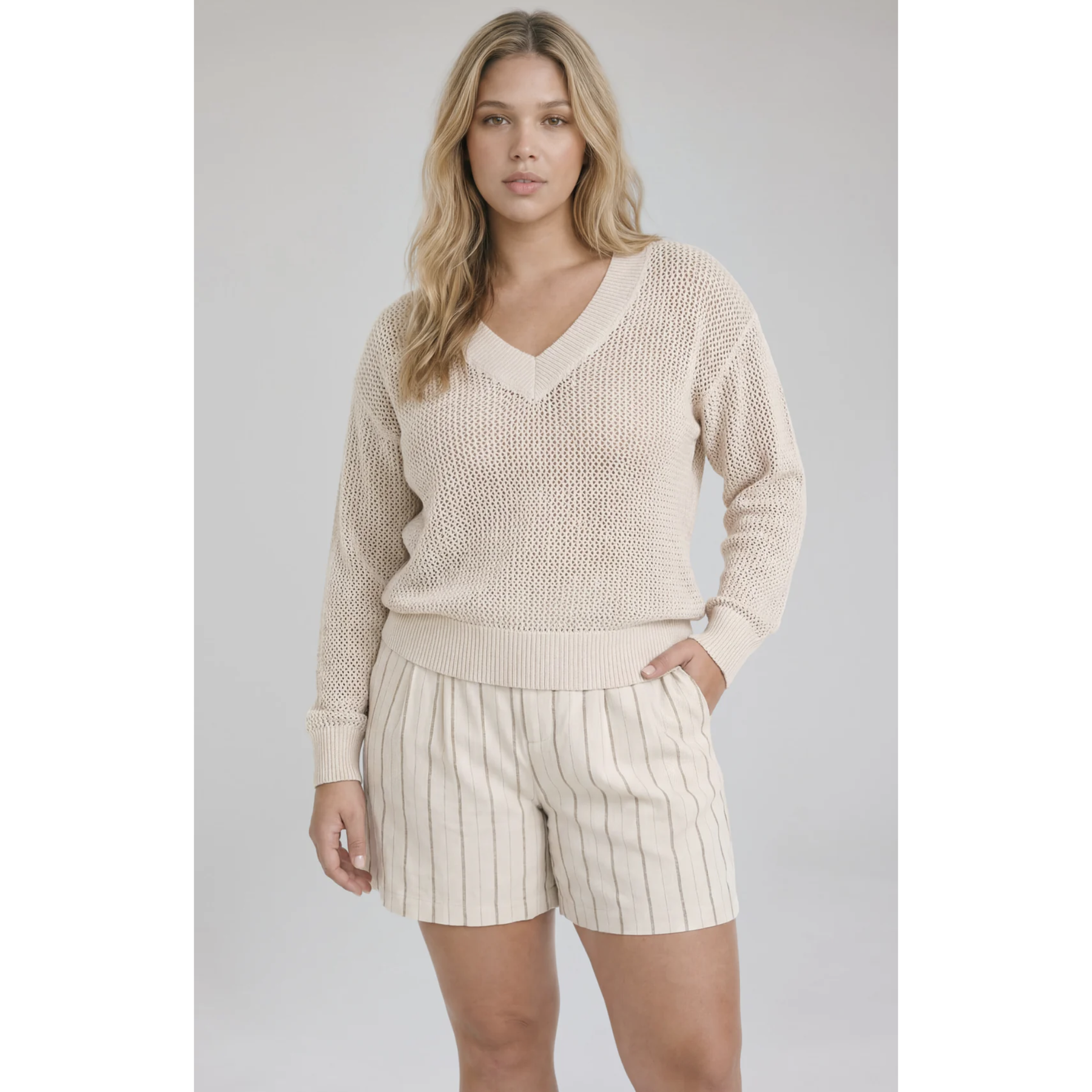 The Jensen sweater is made of a soft yarn in an open knit pattern. Features include a wide rib v-neckline and a relaxed fit for an effortless feel.
