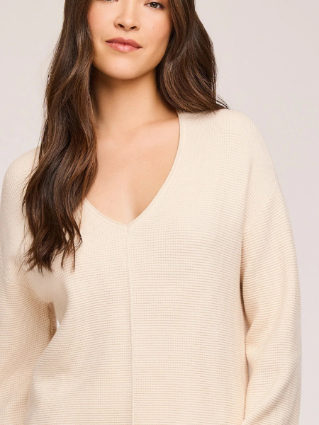 The Lisbon sweater is made of a soft yarn in a waffle knit pattern. Features include side slits and exposed seam details.