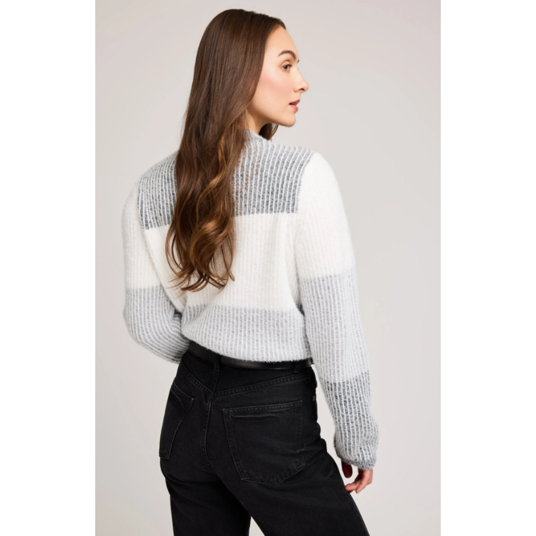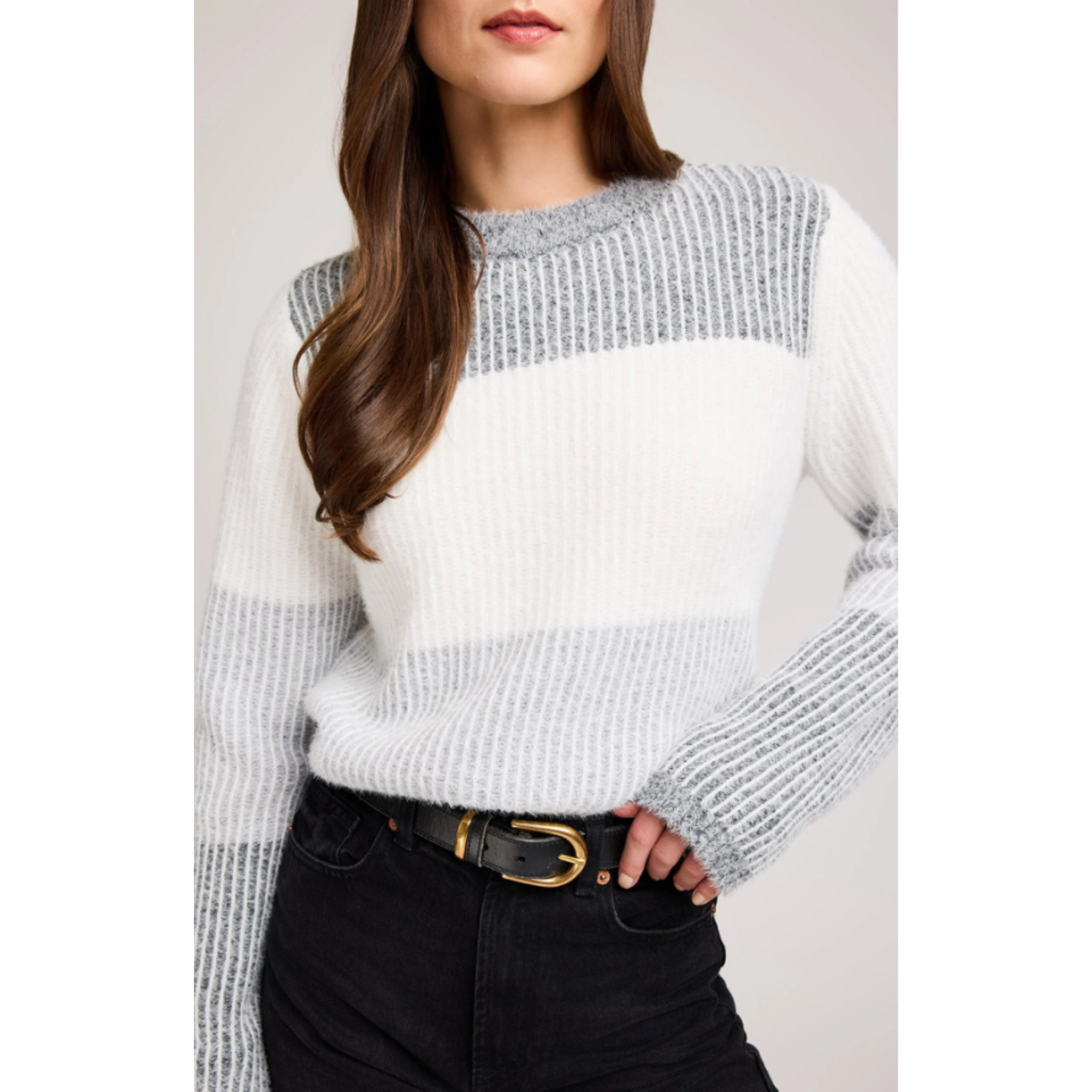 The Lucille sweater is made of a plush yarn in a tonal colorblocked stripe. Features include a crew neckline and perfectly cropped length.