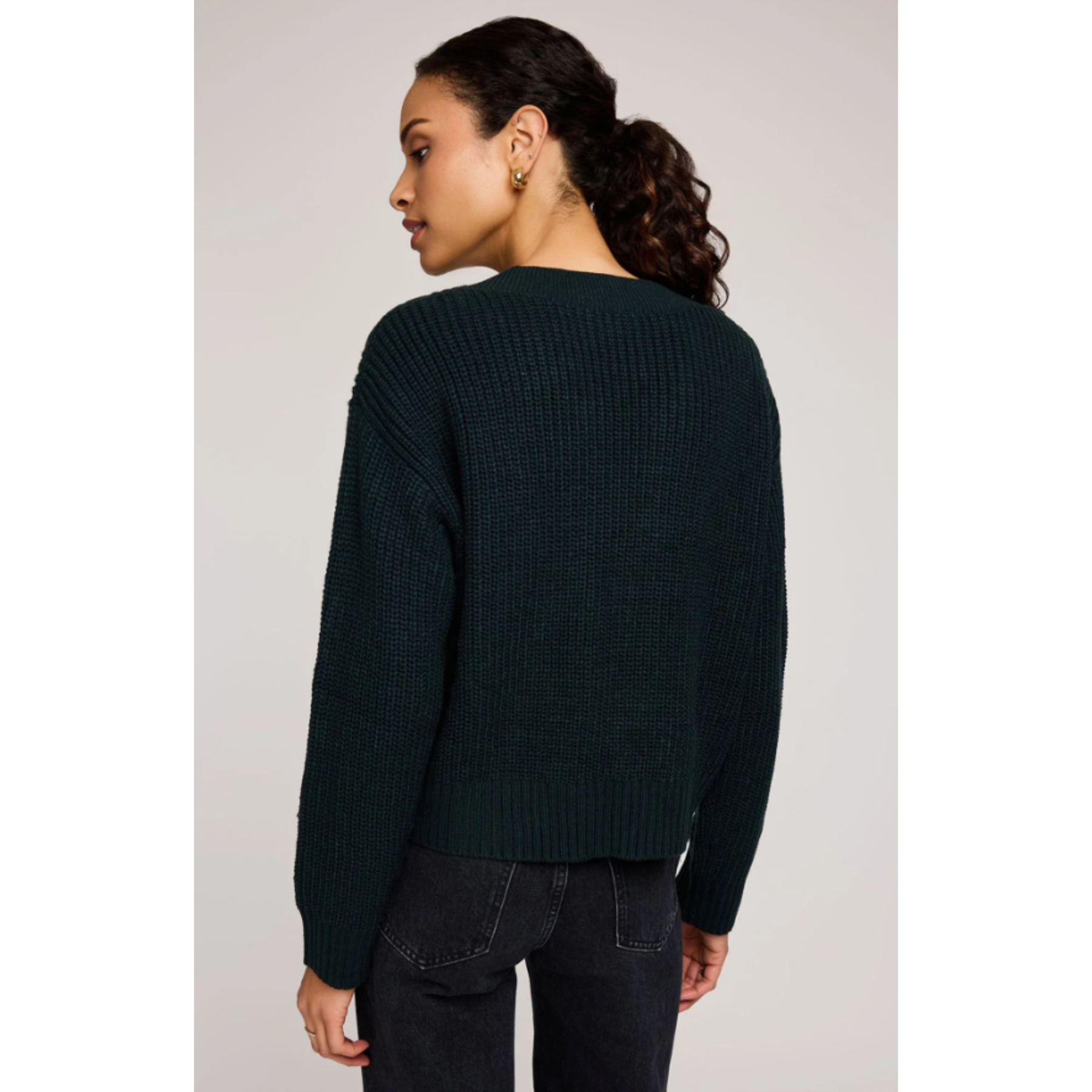 The Marcie sweater is made of a soft yarn. Features include a v-neckline and cable knit details throughout.