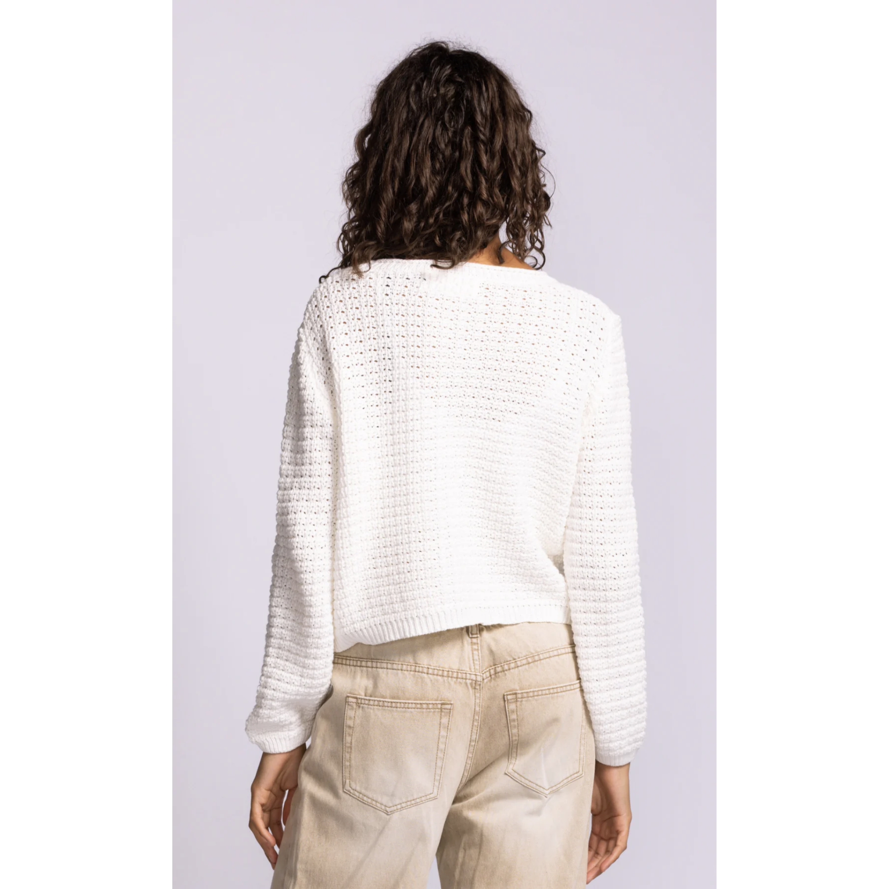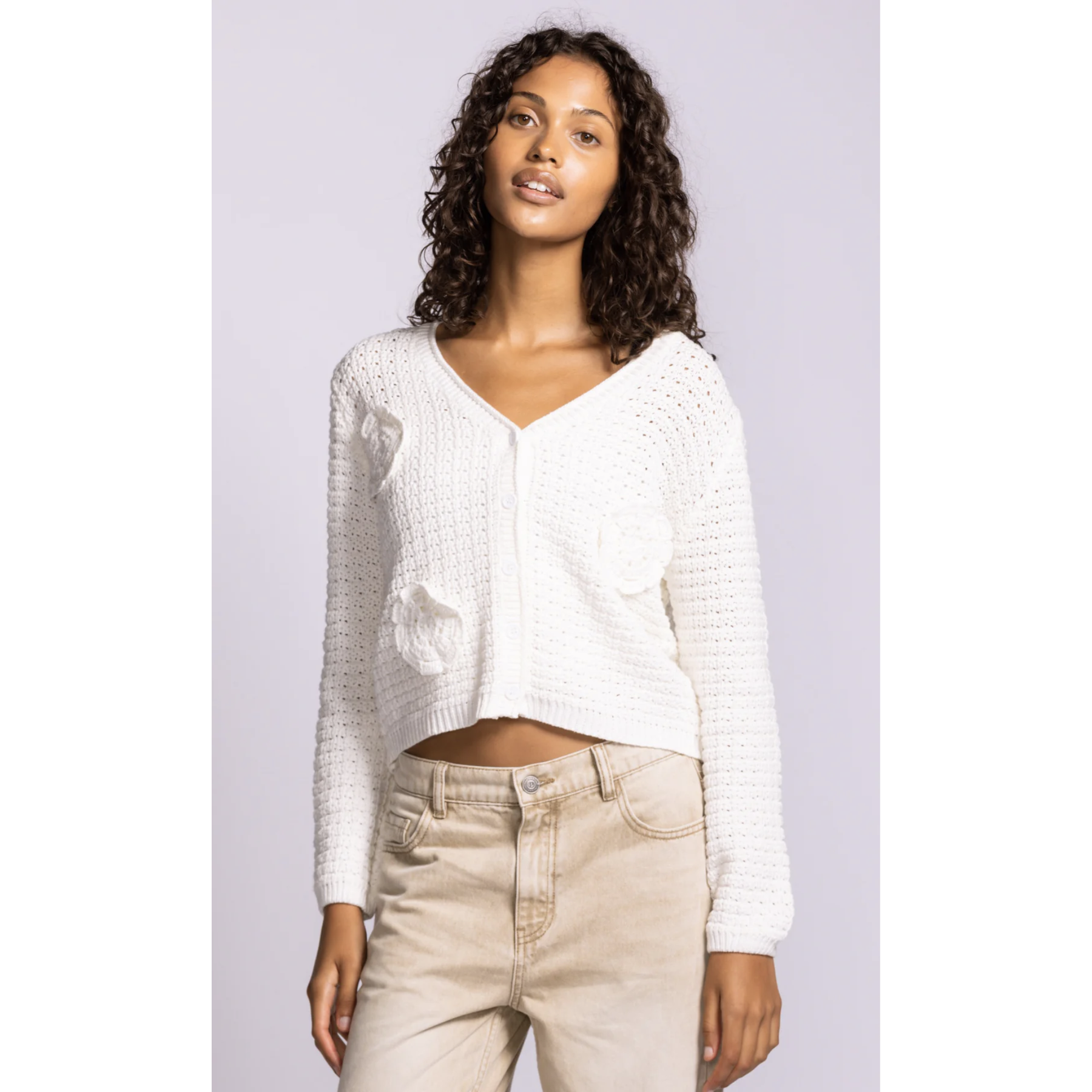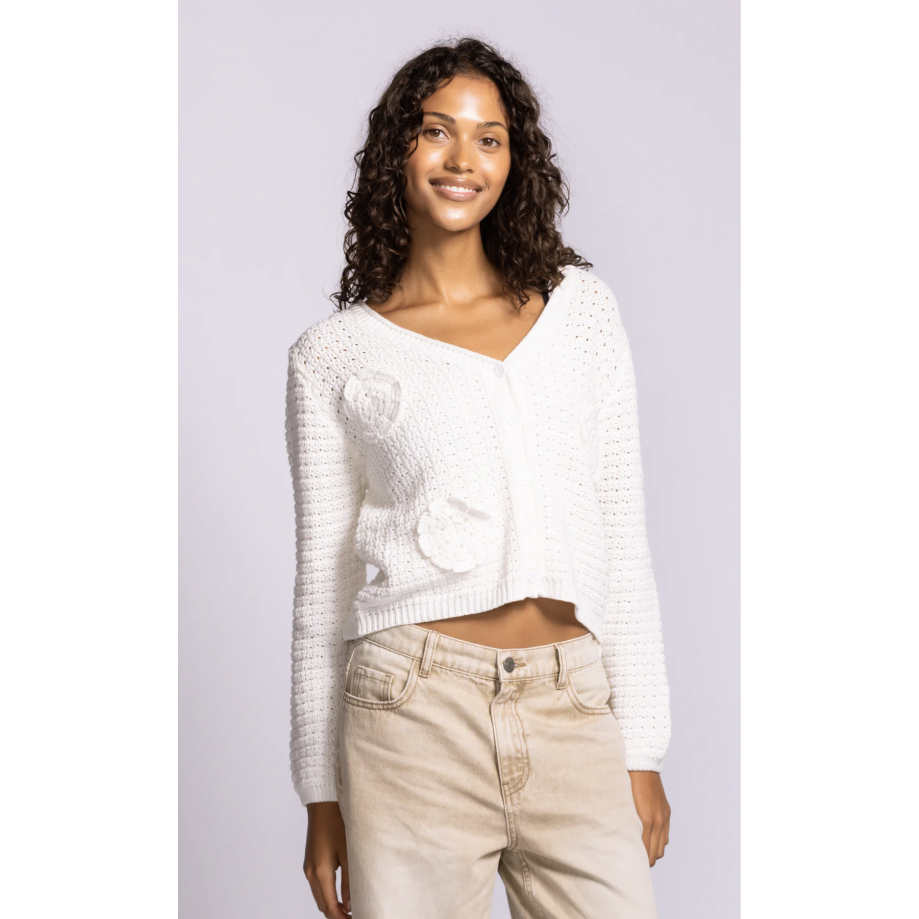 The Pink Martini Camarillo Sweater is a cropped white V-neck cardigan with an open-knit design. Crochet floral patches decorate the chest, while long sleeves taper neatly at the ribbed cuffs. Textured stitches and openwork add depth, and small light buttons allow for a partially closed fit.