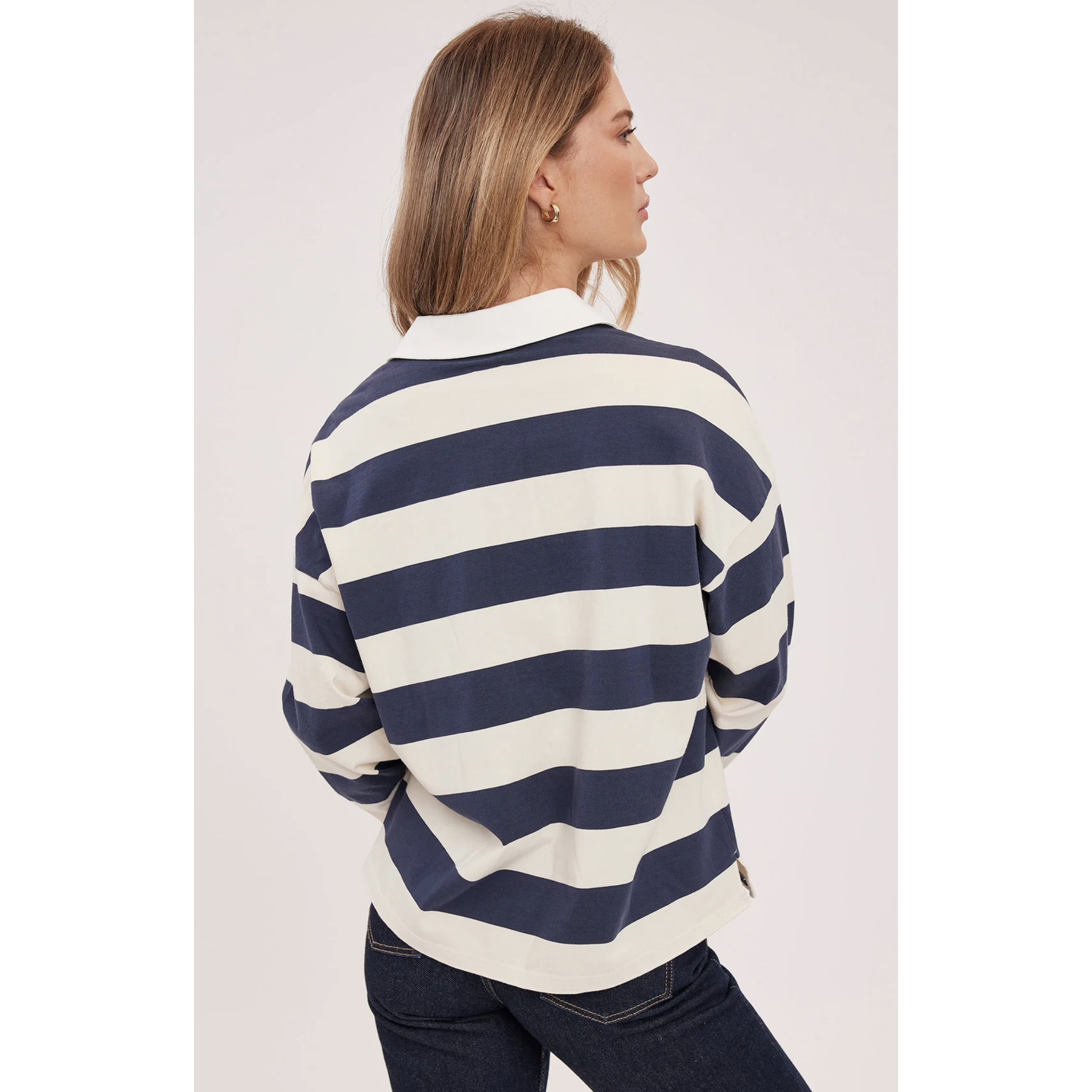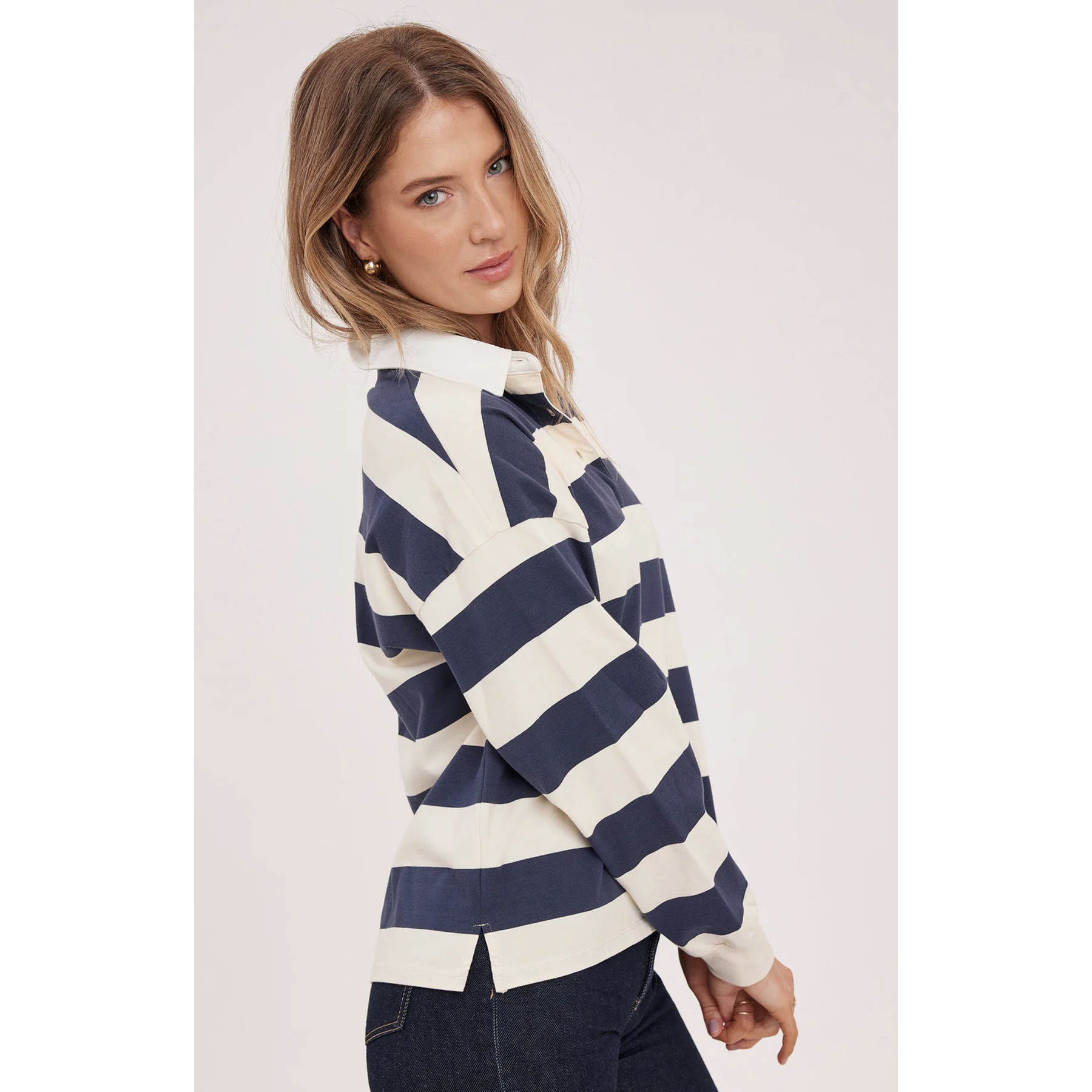 The Britt shirt is crafted from soft cotton jersey and showcases a timeless rugby stripe pattern. It’s designed with a contrasting collar, a half-button placket, and side slits for added comfort and ease of movement.