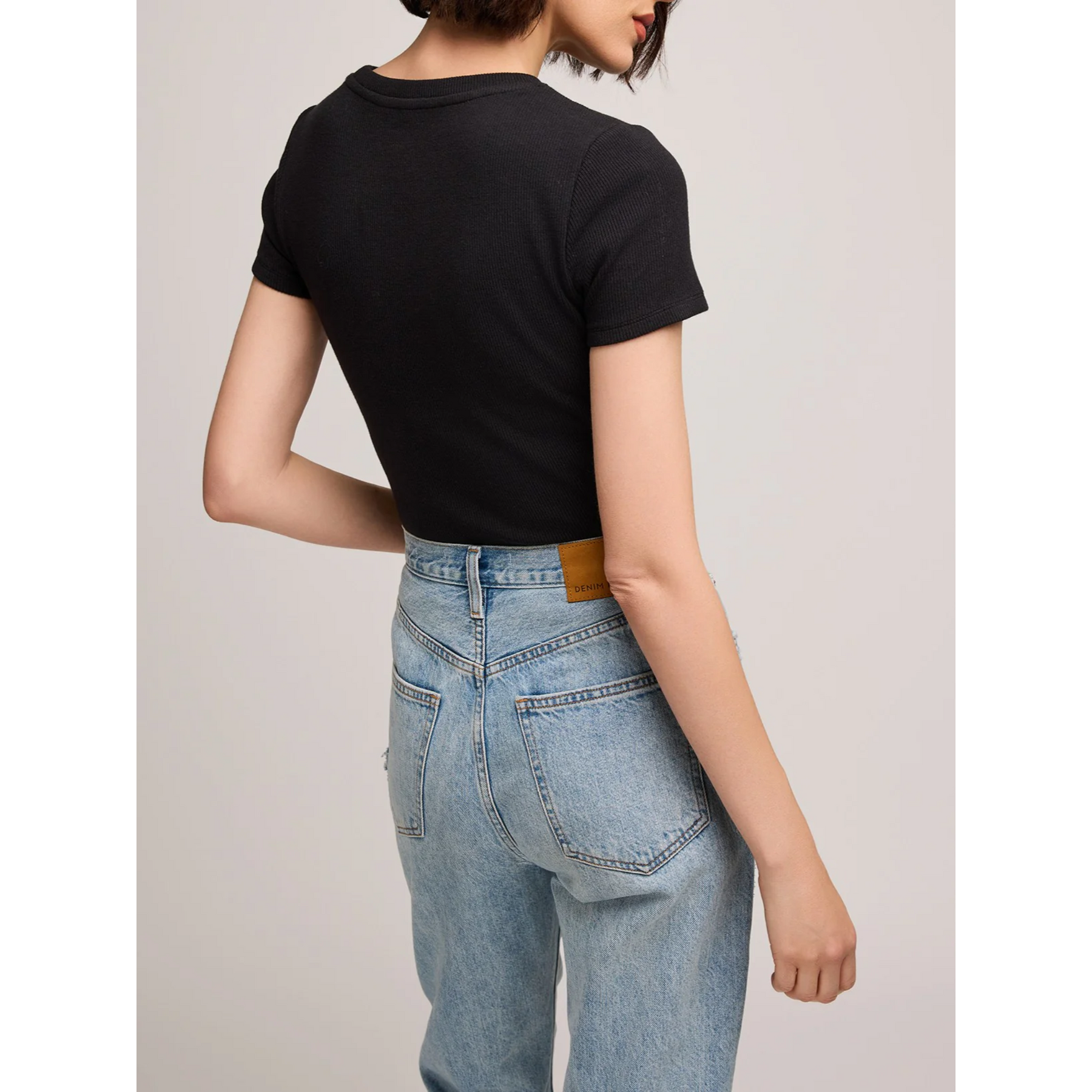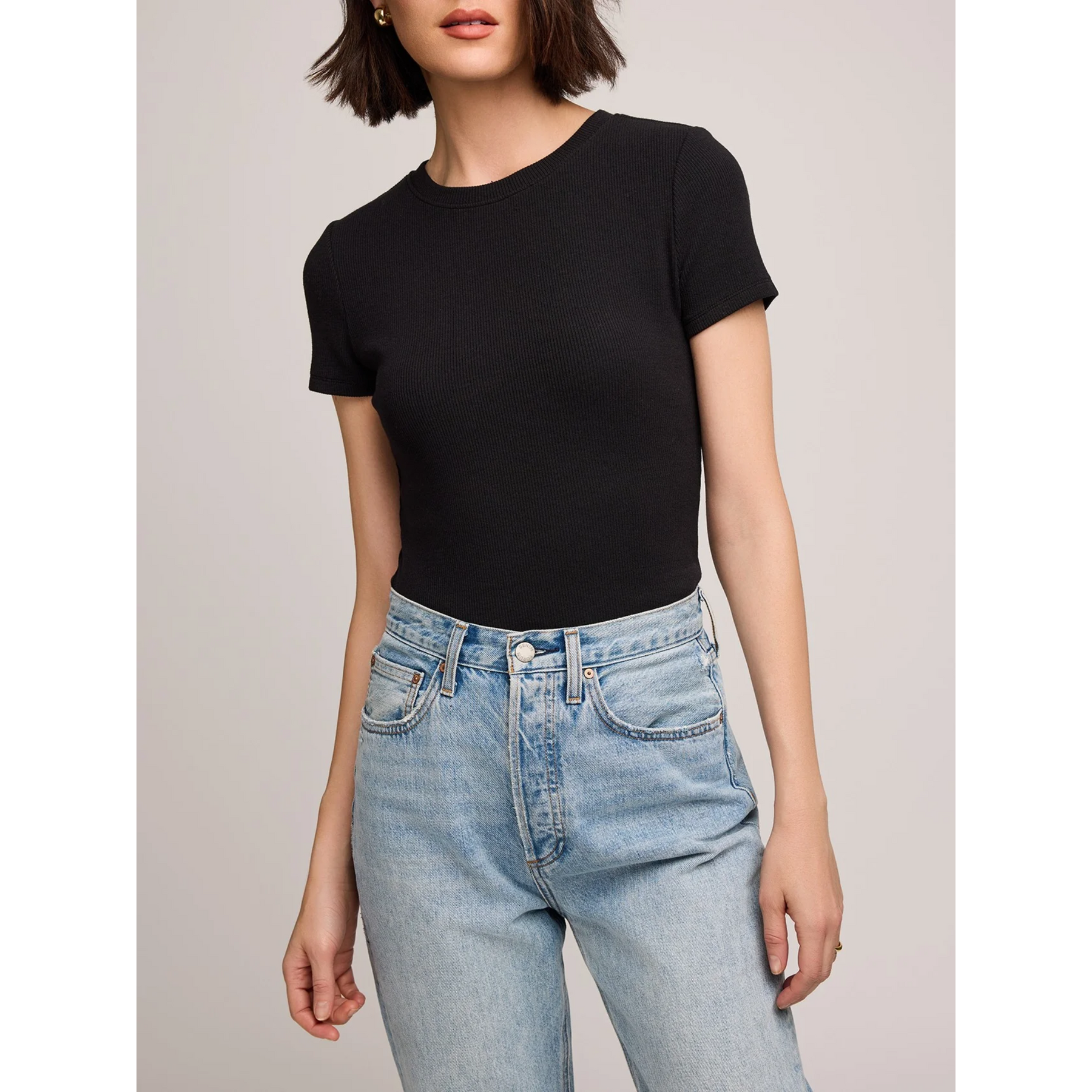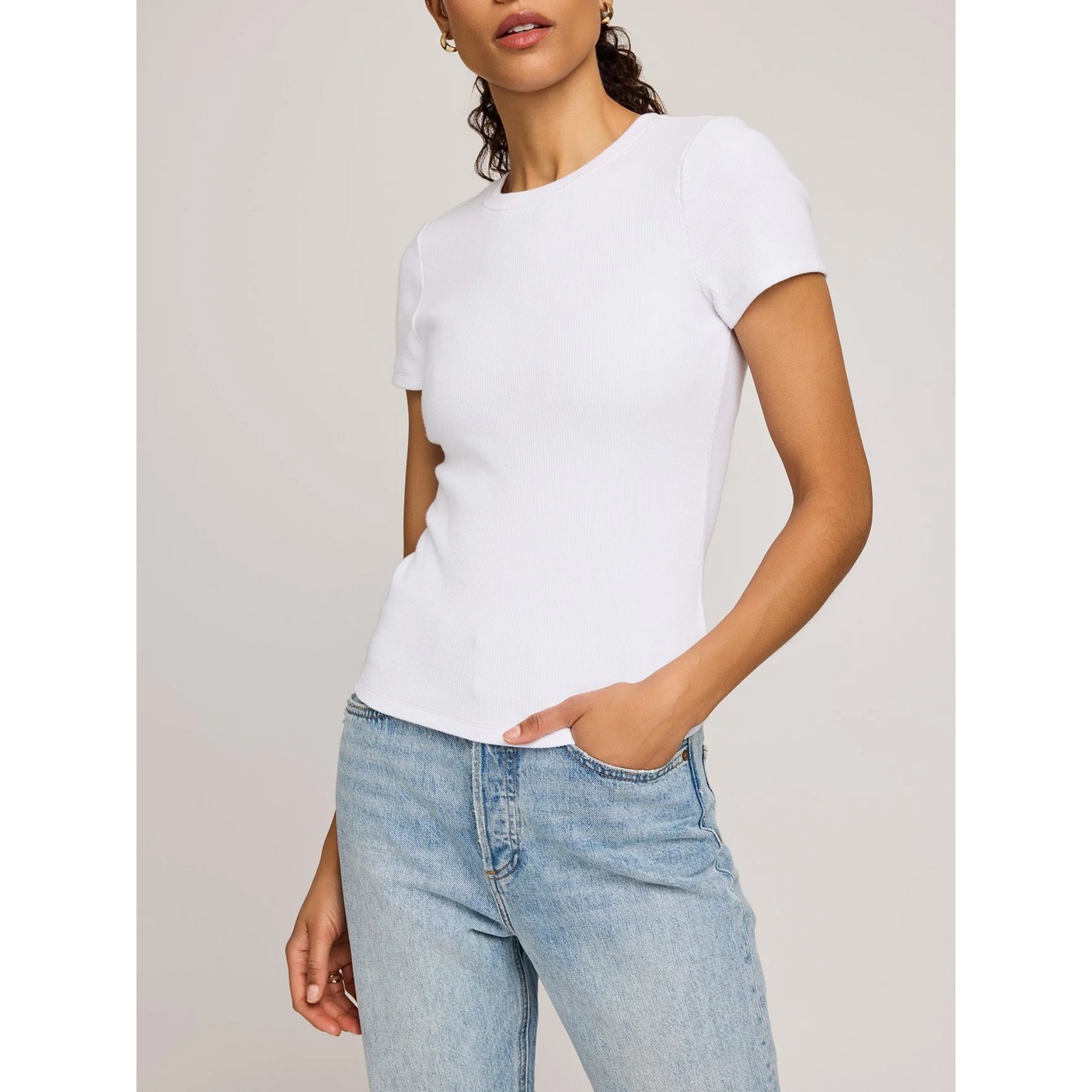 This regular length tee is made of a stretchy ribbed fabric in a crewneck style.